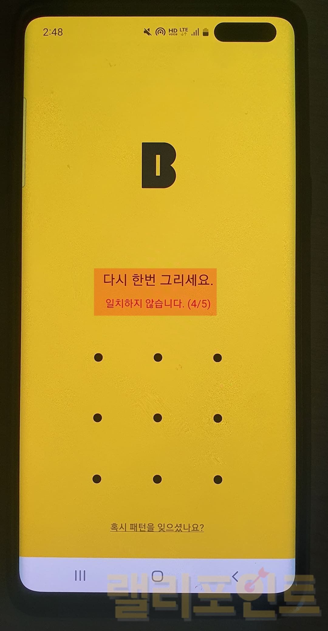 카카오뱅크 어플을 실행하면 잠금화면이 표시되는데 팬턴을 입력하거나 지문을 인증해야 합니다. 그런데 등록한 지문이 없거나, 지문이 여러번 실패할 경우엔 패턴으로만 잠금을 해제해야하는데 패턴이 기억나지 않는다면 여러번 시도끝에 오류 안내를 받아볼 수 있습니다.