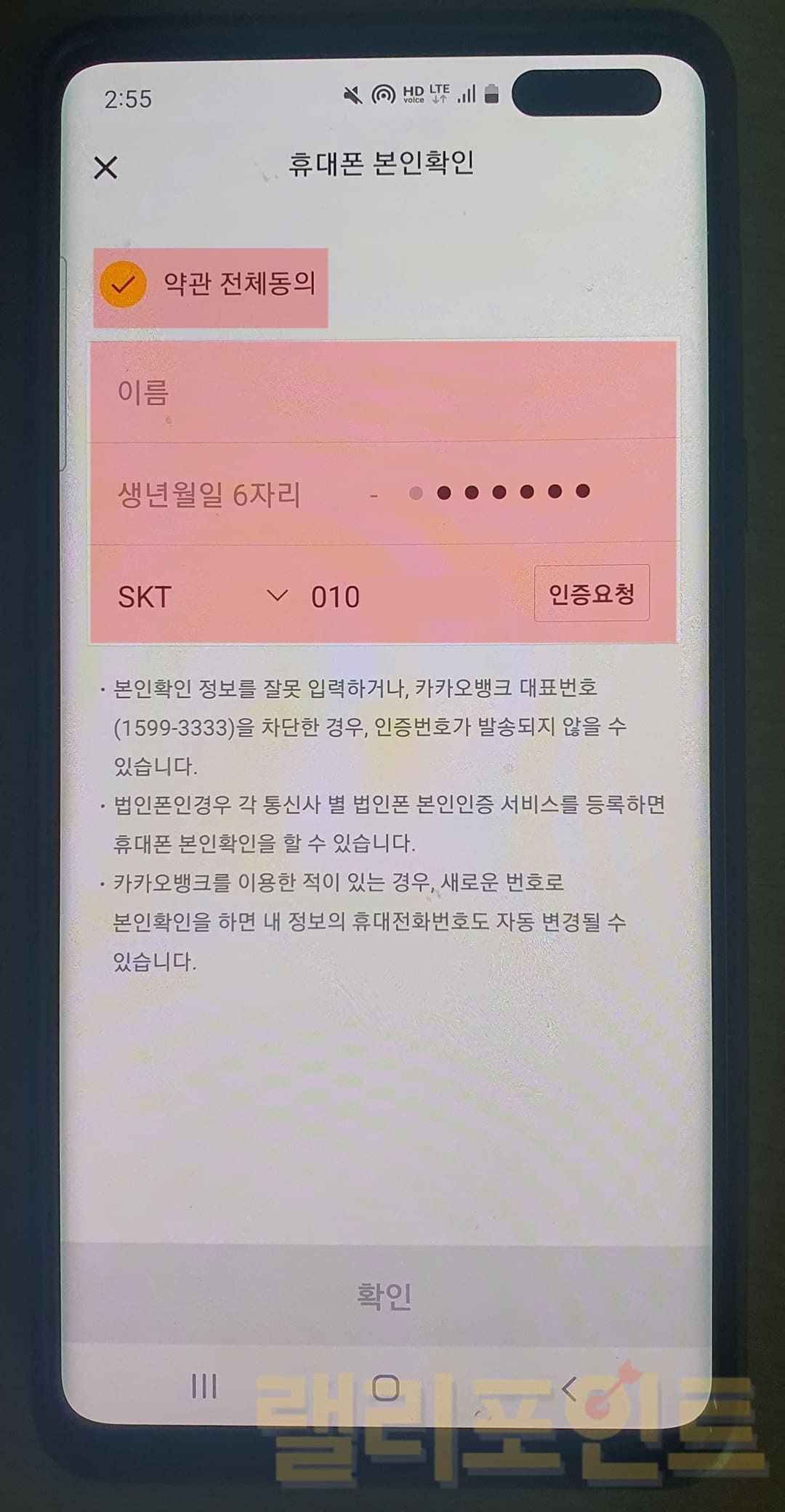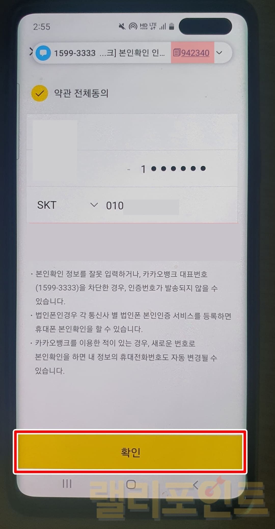- 문자인증번호를 입력하고 확인을 누릅니다.