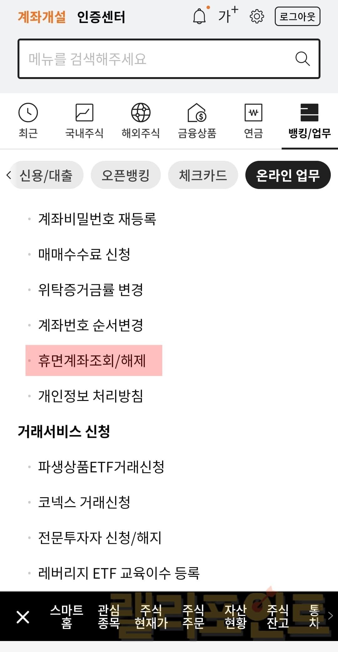 1. 휴면계좌조회/해제를 클릭합니다.