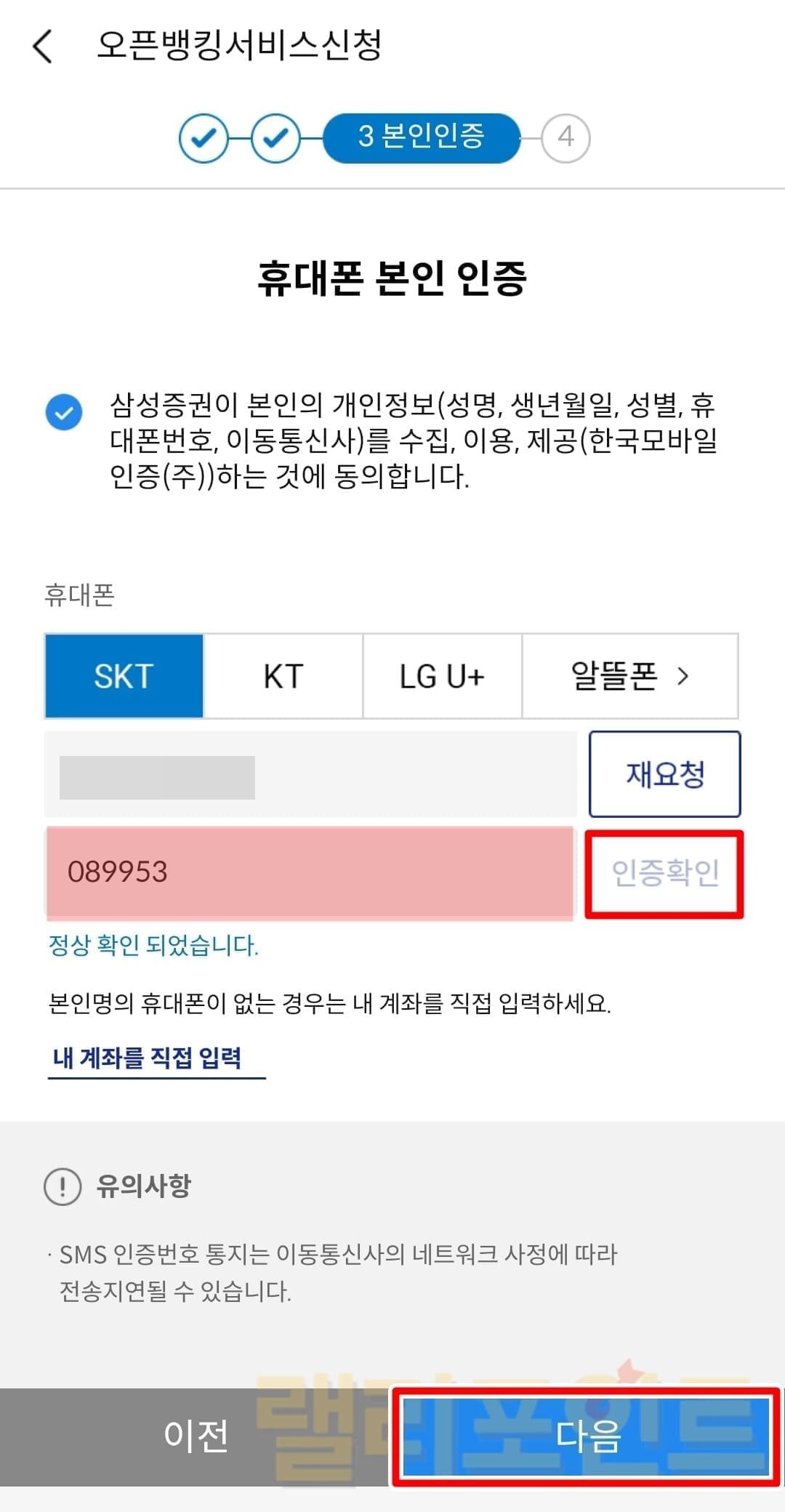 1. 문자 인증번호를 기입하고 인증확인을 클릭합니다.