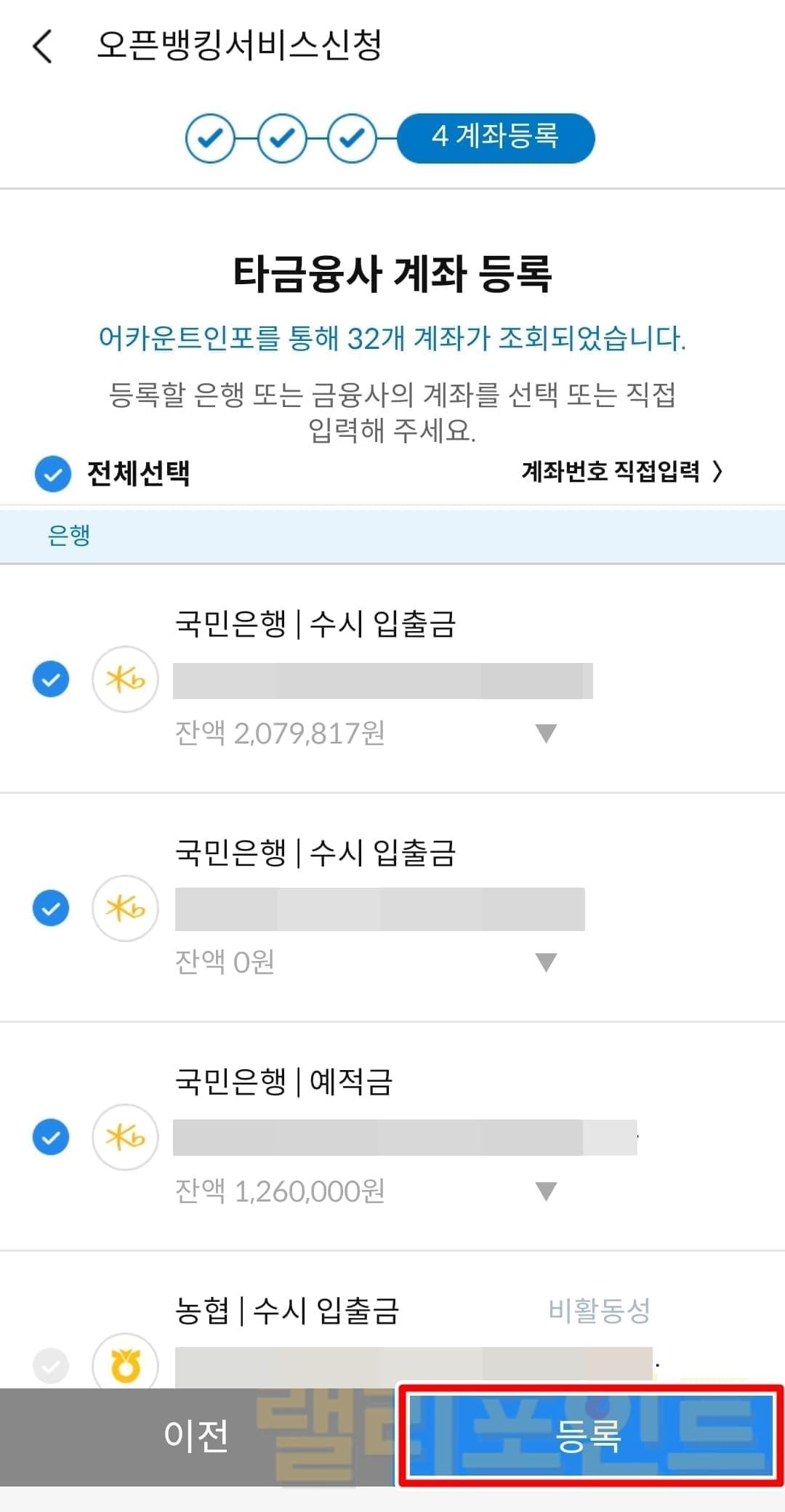 우측 상단의 전체선택을 체크하면 쉽게 모든 계좌를 연결할 수 있습니다.