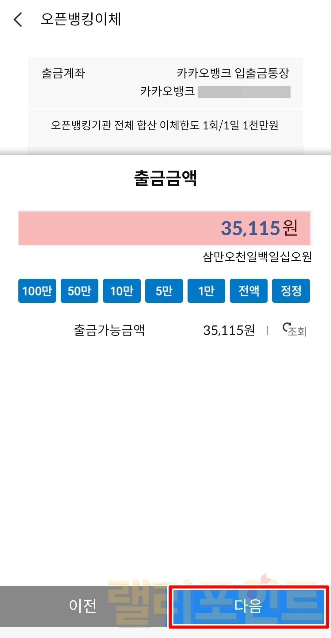 1. 출금금액을 기입하고 다음을 누릅니다.