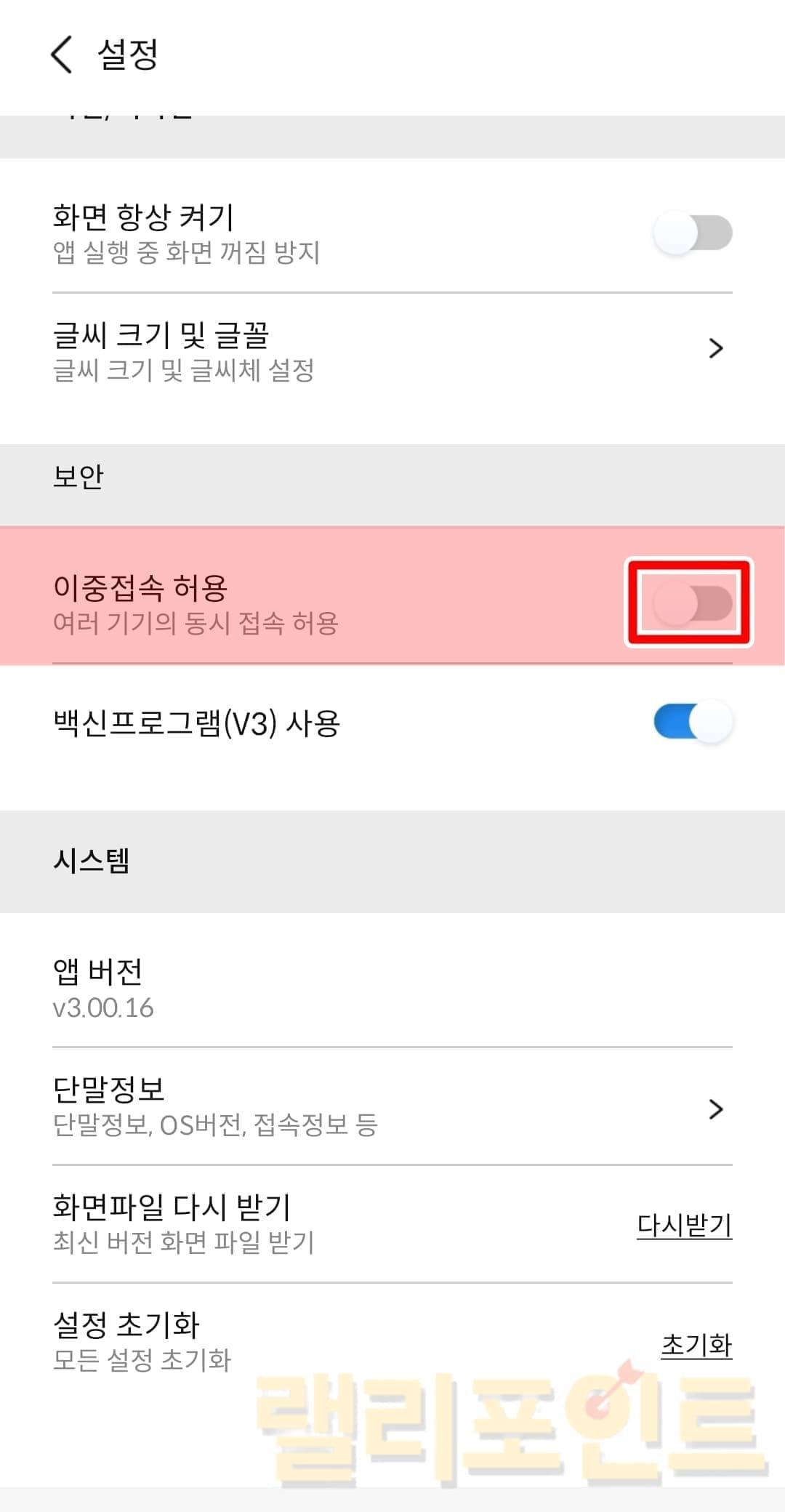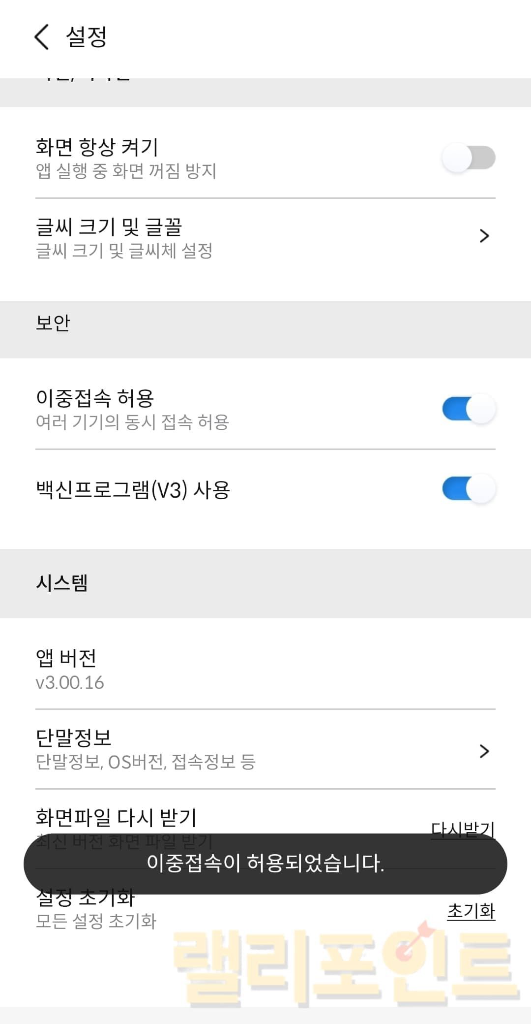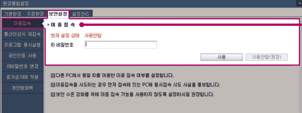 보안설정 > 이중접속을 클릭합니다.