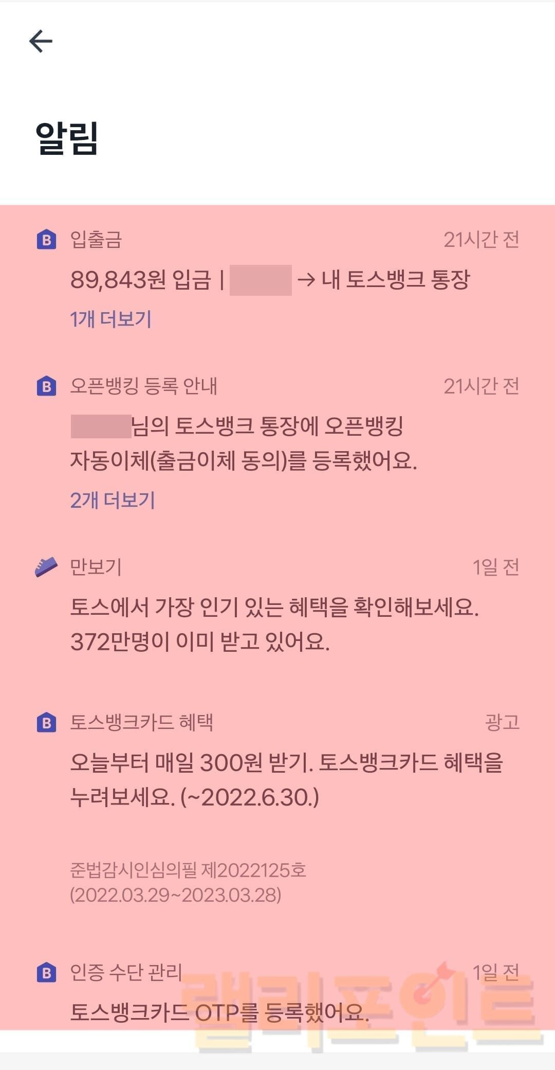 토스증권 알림 뿐만 아니라 토스 어플의 알림도 굉장히 많습니다. 위 사진은 제 토스 알림으로 입금부터 오픈뱅킹 등록안내, 만보기, 카드혜택 등 하루에도 여러가지의 알림들이 수신됩니다. 그래서 토스증권 주식 알림 끄기와 더불어 아래 설정으로 토스 어플의 알림도 해제하는 것을 추천드립니다.
