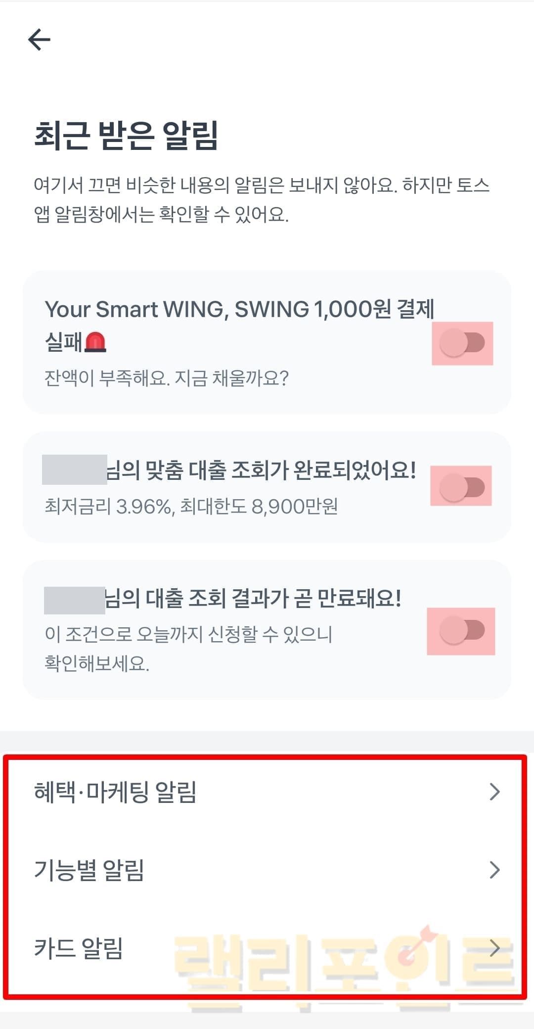 최근 받은 알림을 끄면 비슷한 내용의 알림을 토스에서 다시 보내지 않습니다.