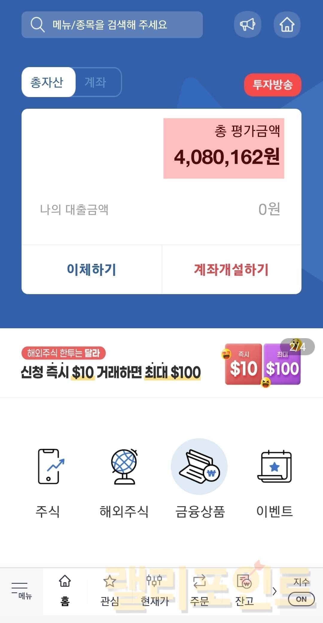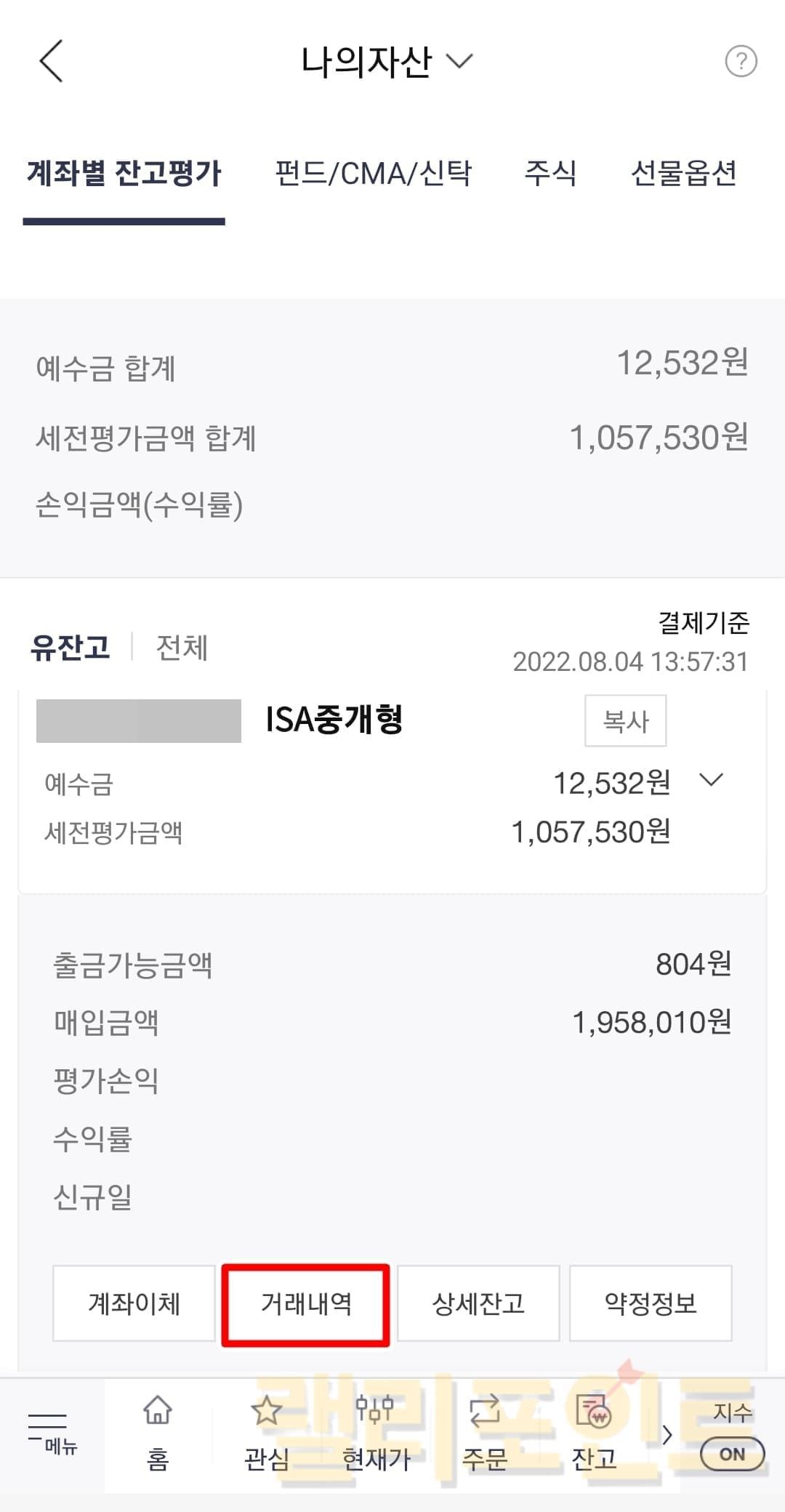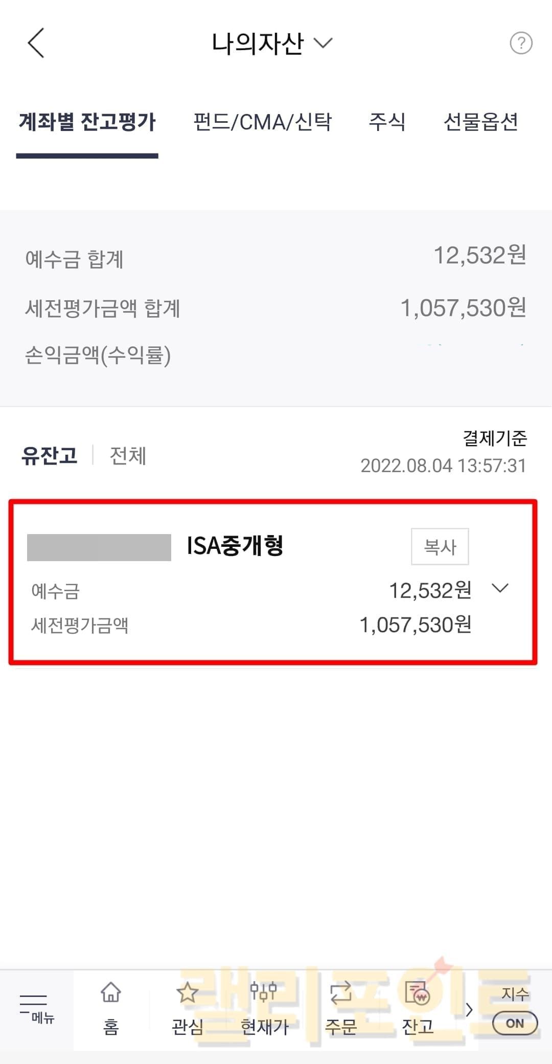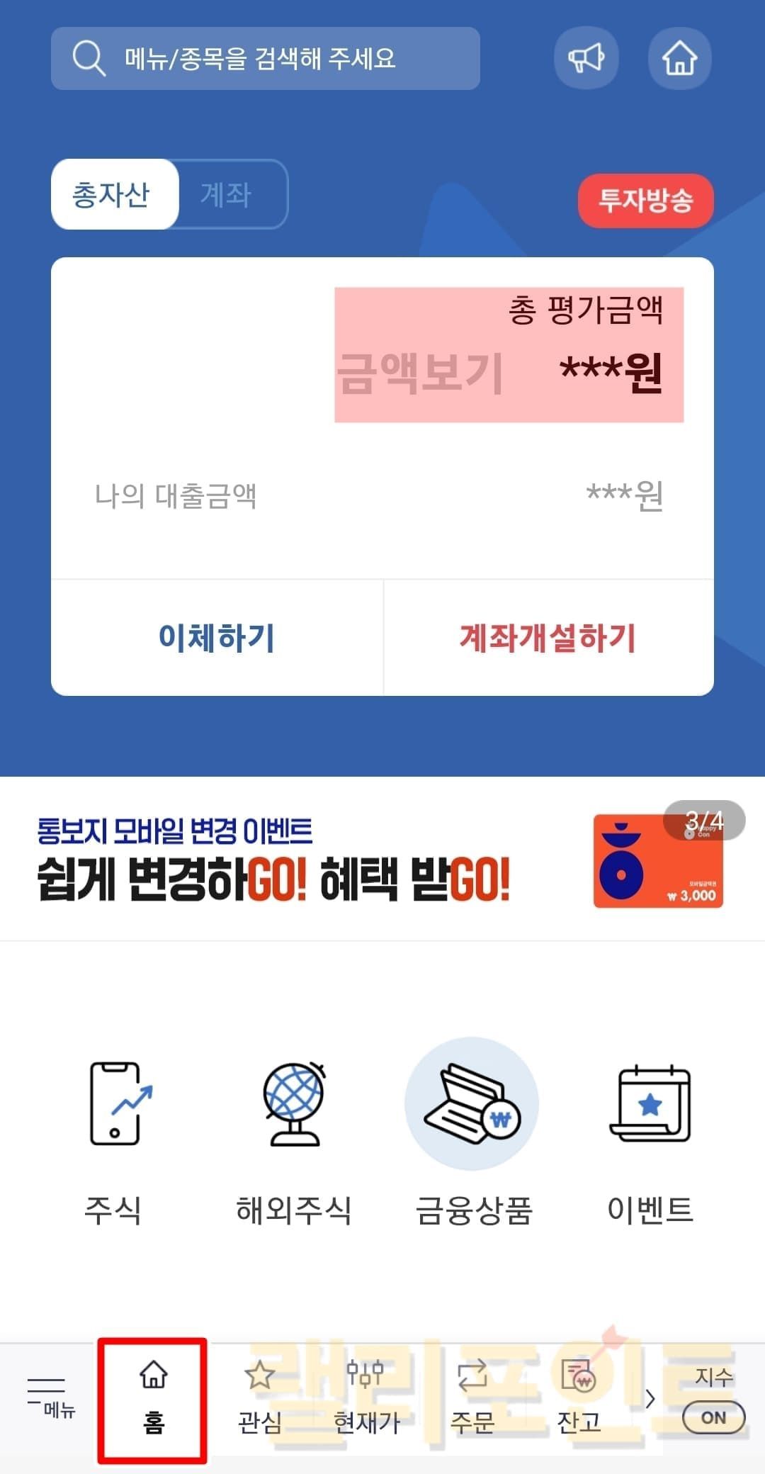 1. 홈에서 다시 숫자로 표기된 나의 총 평가금액을 누릅니다.