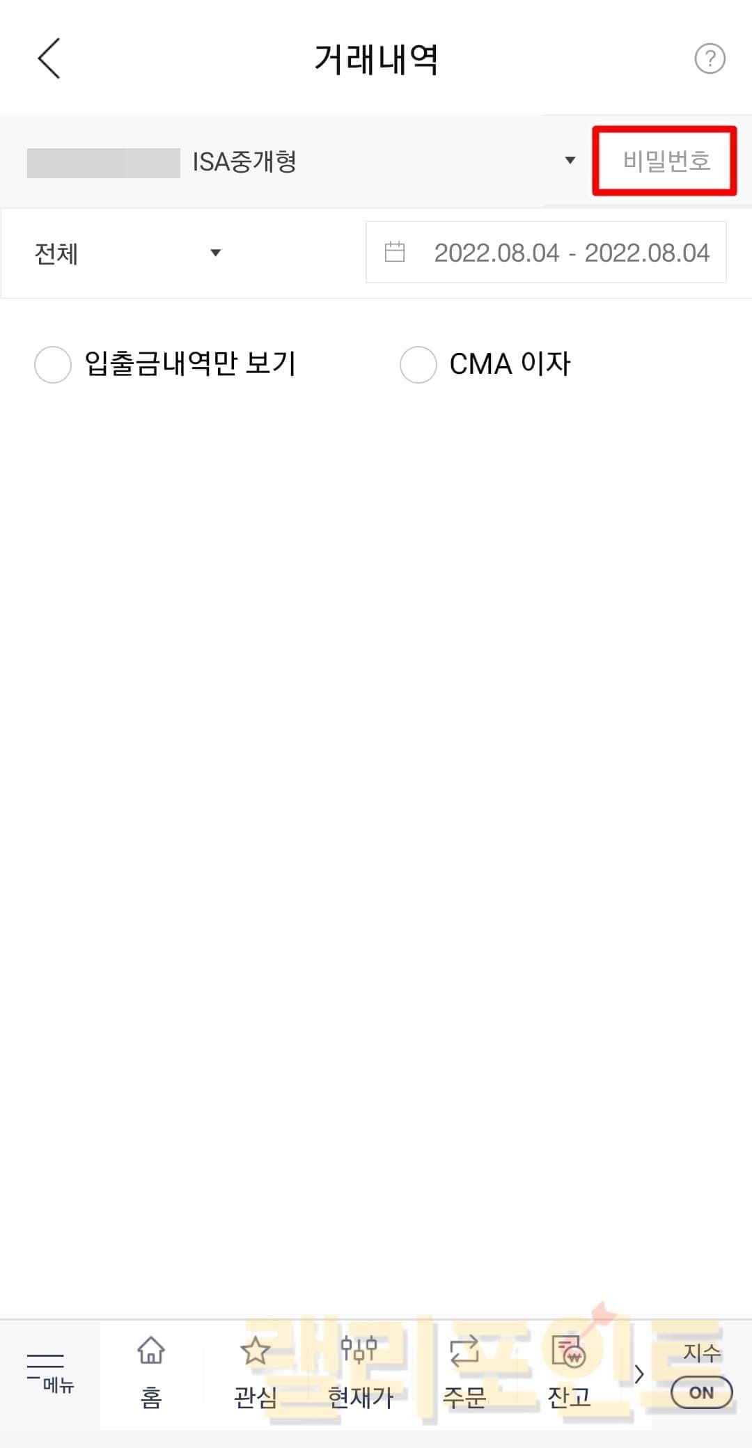 1. 계좌번호 우측의 비밀번호를 눌러 입력합니다.
