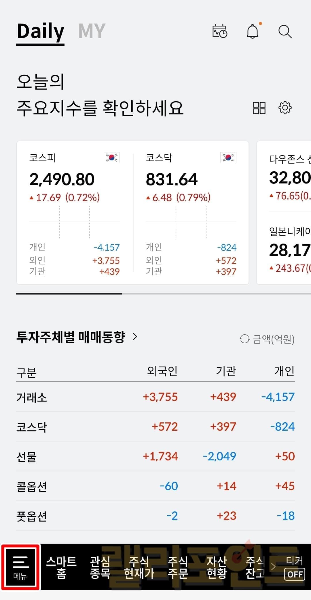 - 스마트폰에서 한화투자증권 MTS 어플을 실행합니다.