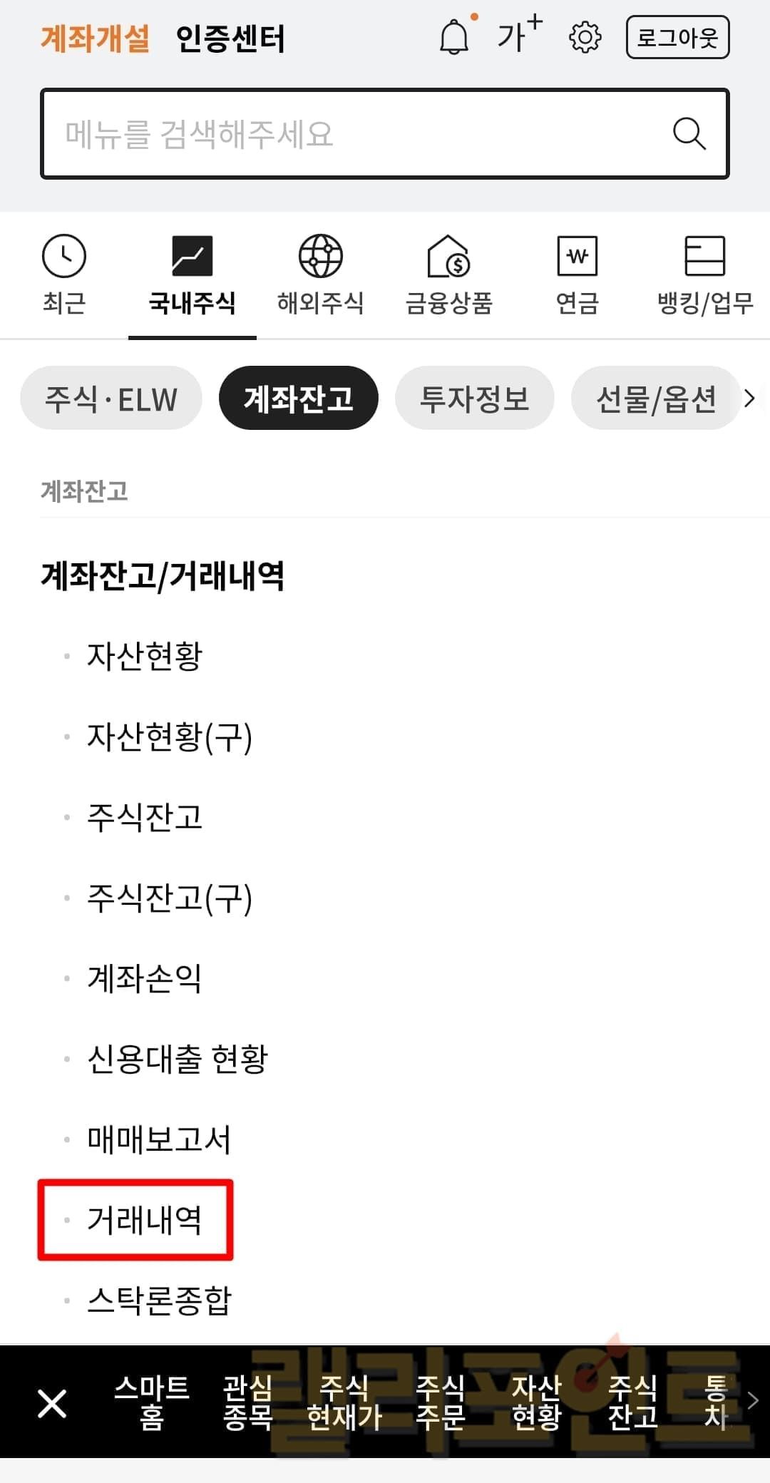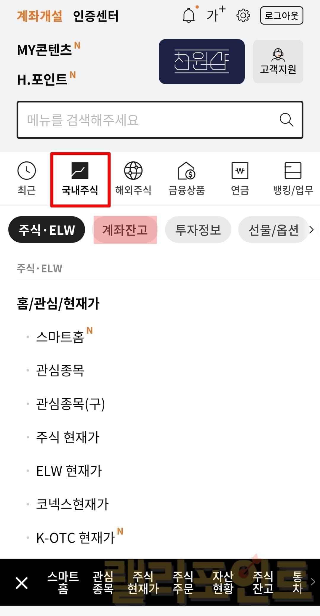 - 국내주식에서 계좌잔고 메뉴를 누릅니다.