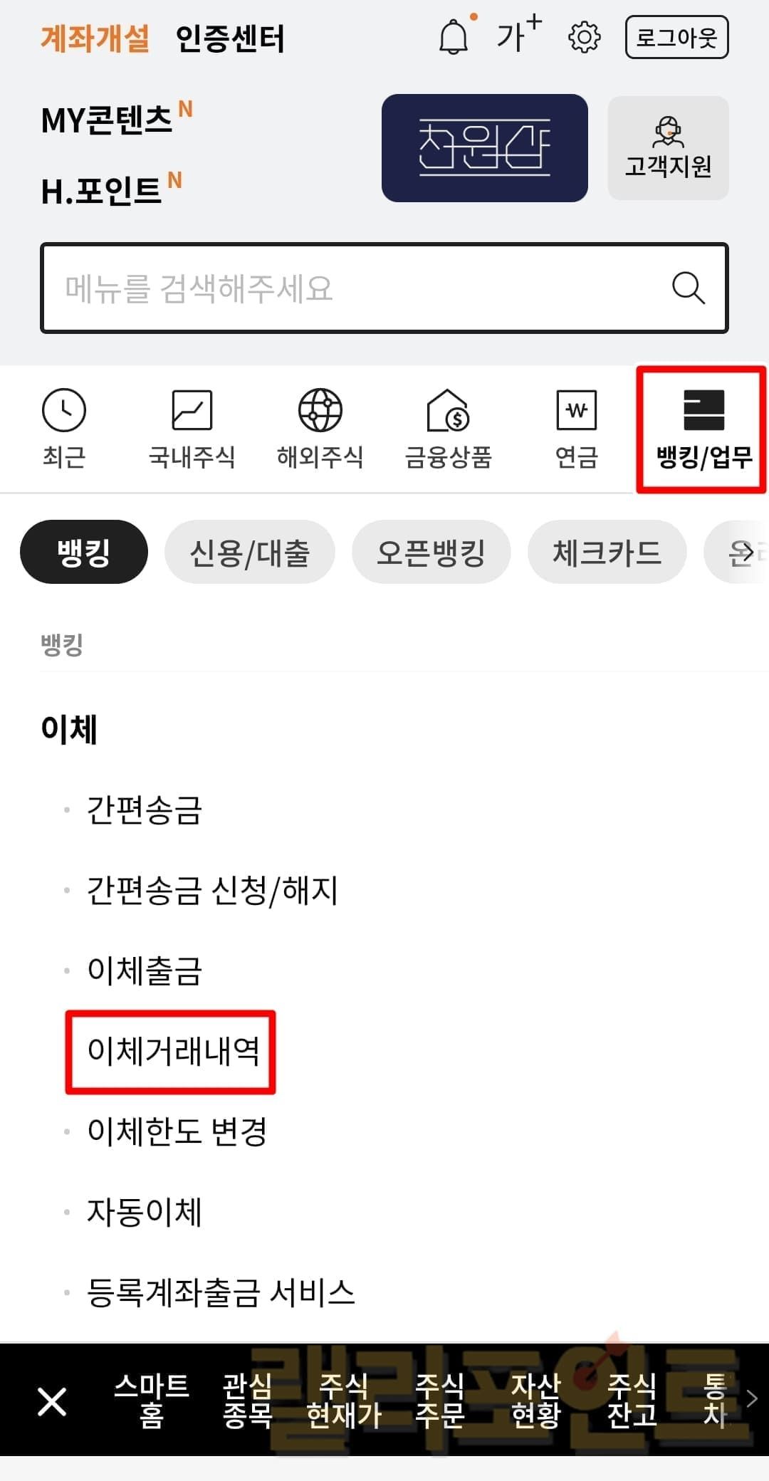 - 한화투자증권 MTS 앱에서 메뉴 > 뱅킹/업무 > 이체거래내역을 클릭합니다.