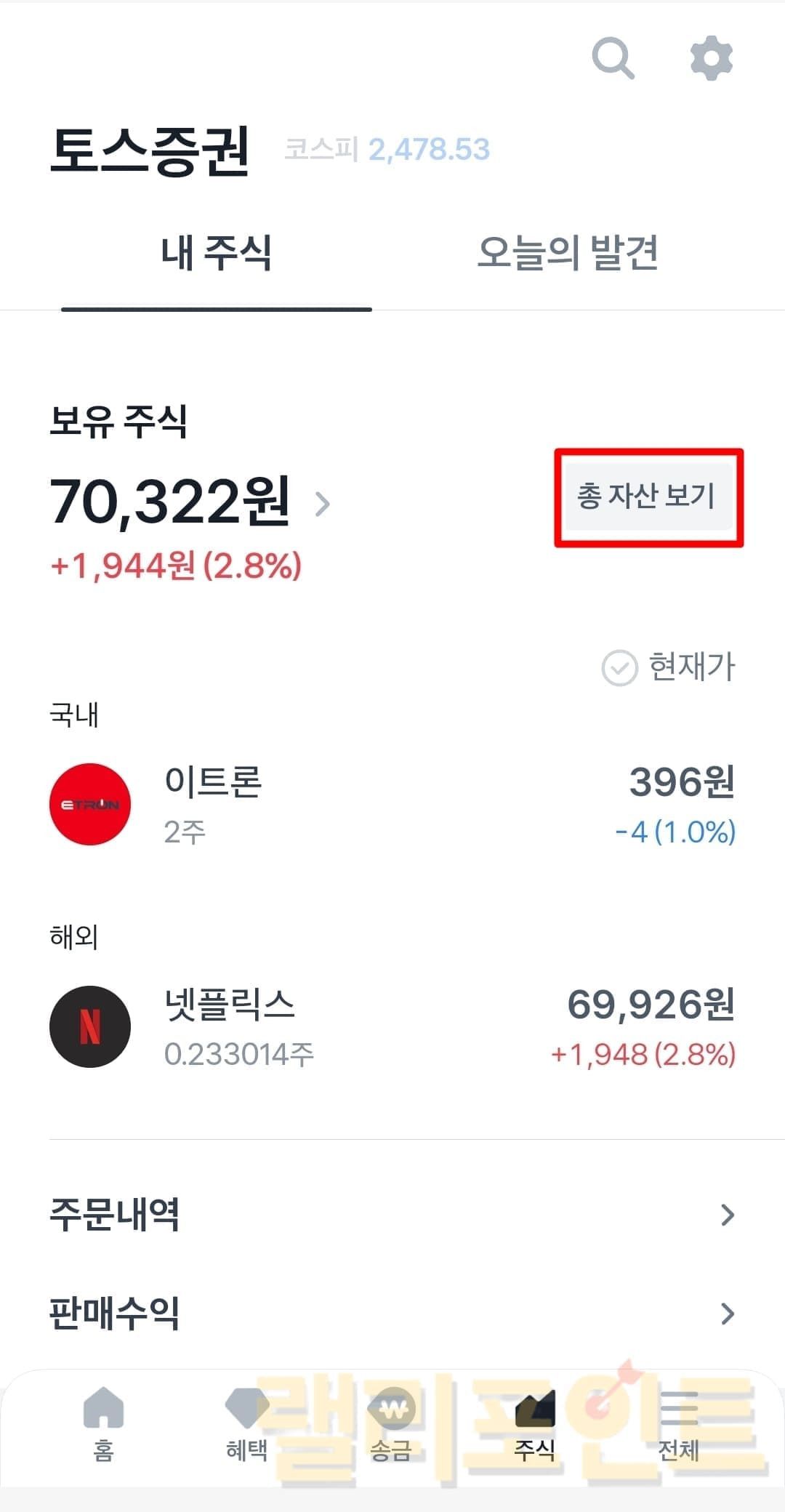 1. 토스증권 주식 메뉴에서 총 자산 보기를 클릭합니다.