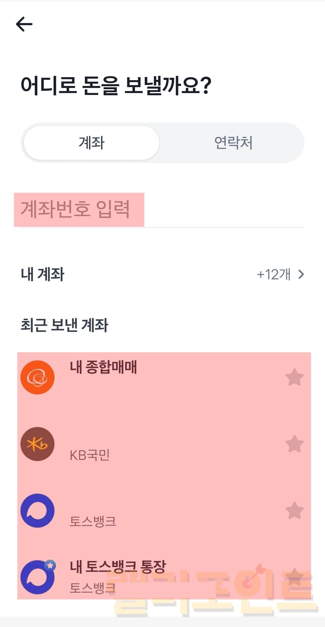 1. 은행계좌를 직접 기입하거나 최근보낸계좌에서 선택합니다.