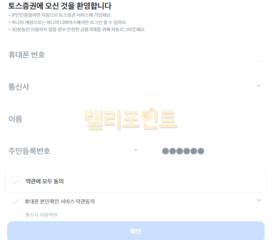 토스증권에 등록된 나의 휴대폰번호, 통신사, 이름, 주미나등록번호를 기입하시면 됩니다.