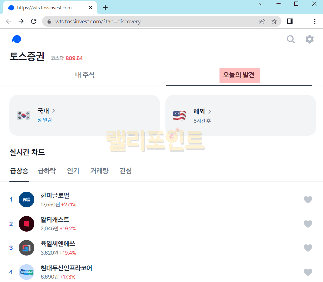 오늘의 발견- 실시간 차트로 인기, 거래량, 관심, 급상승, 급하락 순위를 확인할 수 있습니다. 또한 주식대가들의 투자종목, 배당추천 주식들과 다양한 주식 정보 및 인기 커뮤니티를 확인할 수 있습니다.