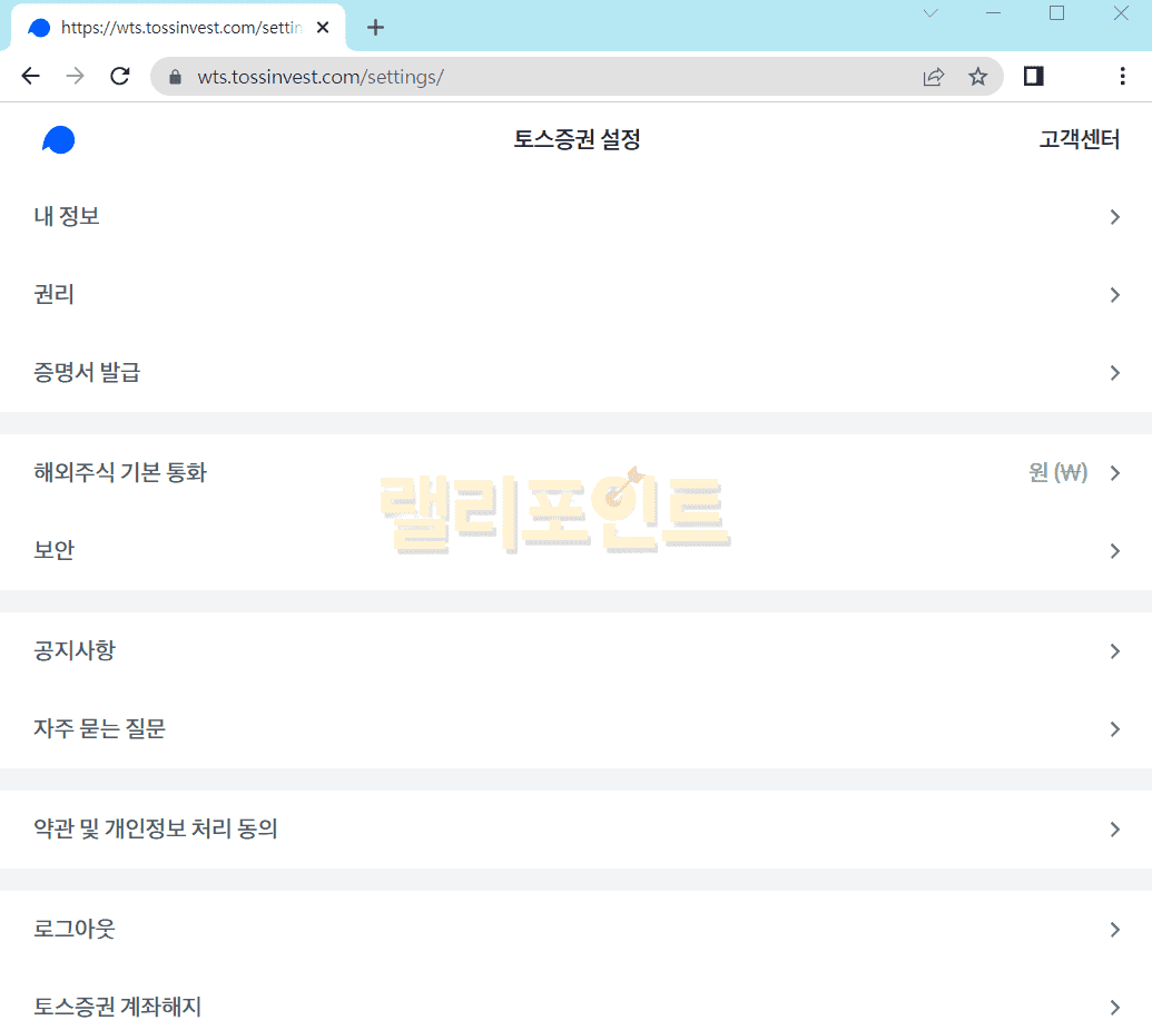 환경 설정- 내정보, 권리, 증명서 발급, 해외주식 기본 통화 설정, 보안, 공지사항, 자주 묻는 질문, 로그아웃, 계좌해지 등의 기능을 이용할 수 있습니다.