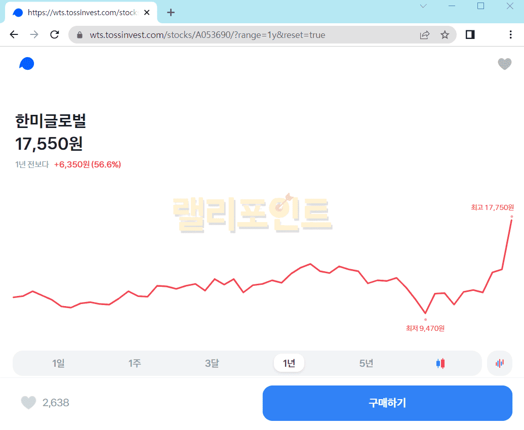 주식을 검색해서 클릭하면 토스증권 PC에서도 주식차트를 볼 수 있습니다. 차트는 1일, 1주, 3달, 1년, 5년 단위로 볼 수 있고 캔들형태를 눌러 차트모양을 변경할 수도 있습니다.