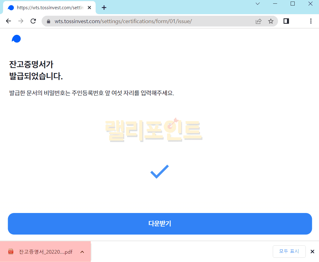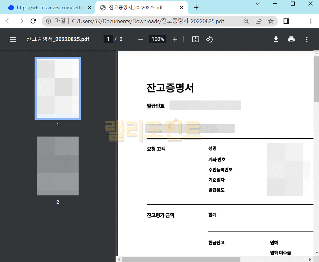 화면이 넓고, 컴퓨터에서도 주식투자를 할 수 있는 것 외에 제가 생각하는 토스증권 PC버전 사용의 가장 큰 이유는 바로 주식관련 증명서 발급이 매우 편리하다는 것입니다. 토스증권 MTS 앱을 이용했다면 스마트폰에 다운로드된 파일을 다시 컴퓨터로 옮겨야하는 과정이 자주 필요했는데 토스증권 PC버전 WTS에서는 증명서 발급시 바로 PDF 파일을 컴퓨터에 다운로드 받을 수 있다는 것이 매우 편리하더군요.