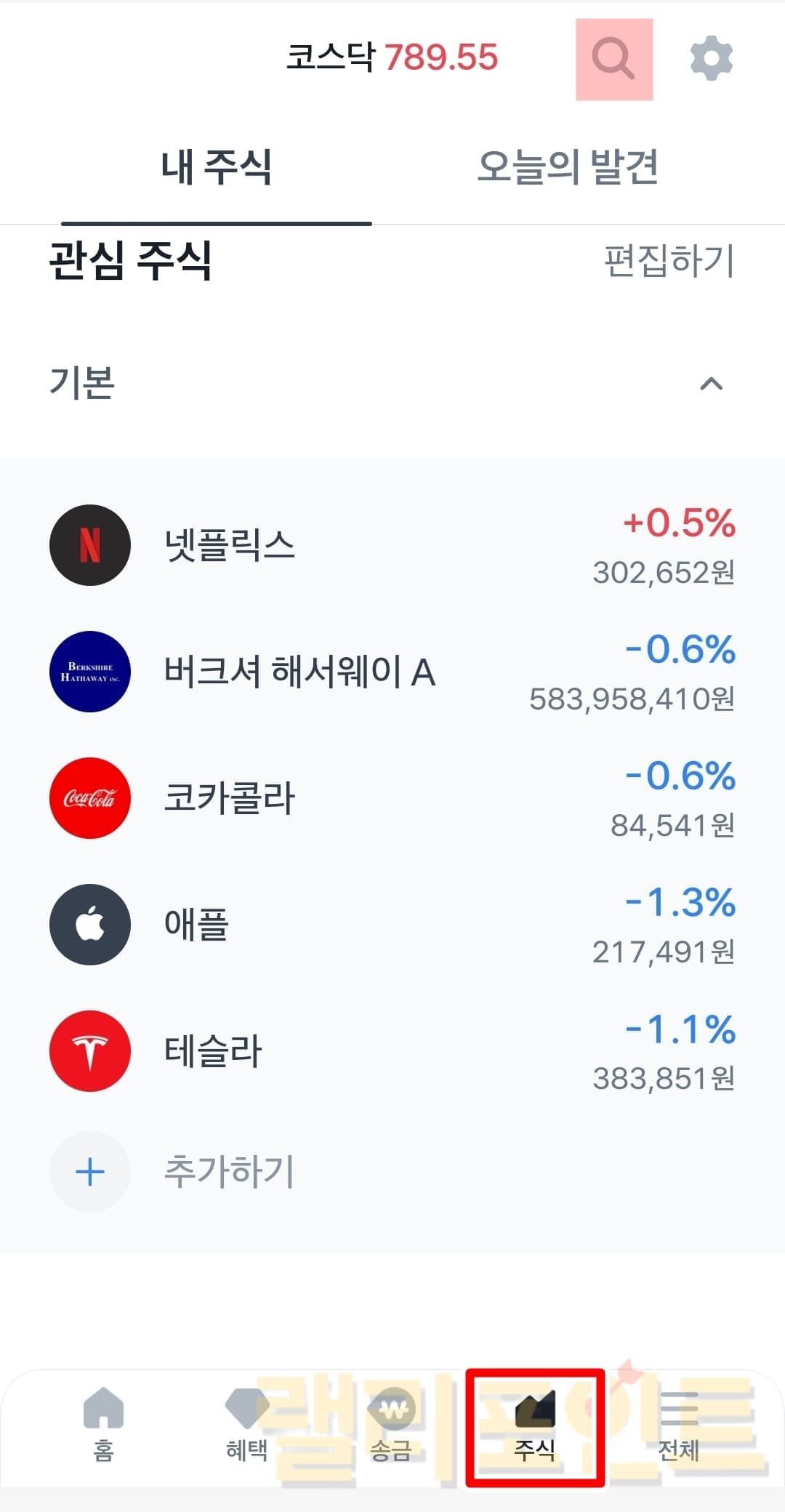 상단의 돋보기 검색 버튼을 누릅니다.