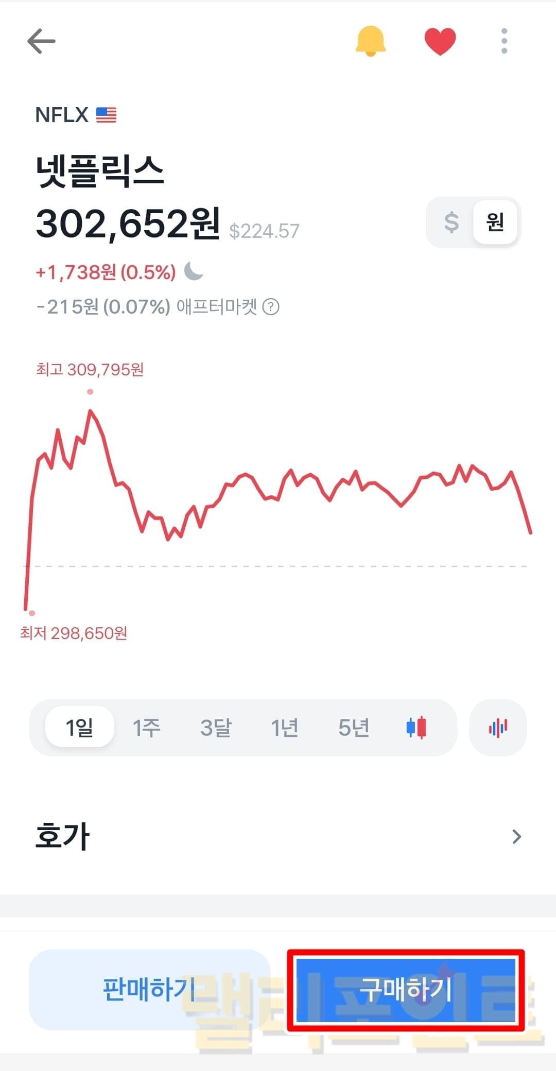 이곳에서 현재 사고 싶은 해외주식의 가격과 차트, 호가를 확인해볼 수 있습니다. 또 지금은 매수를 위해서 구매하기를 눌렀지만 반대로 매수한 해외주식을 팔고 싶을 땐 옆에 있는 판매하기를 이용하시면 됩니다,