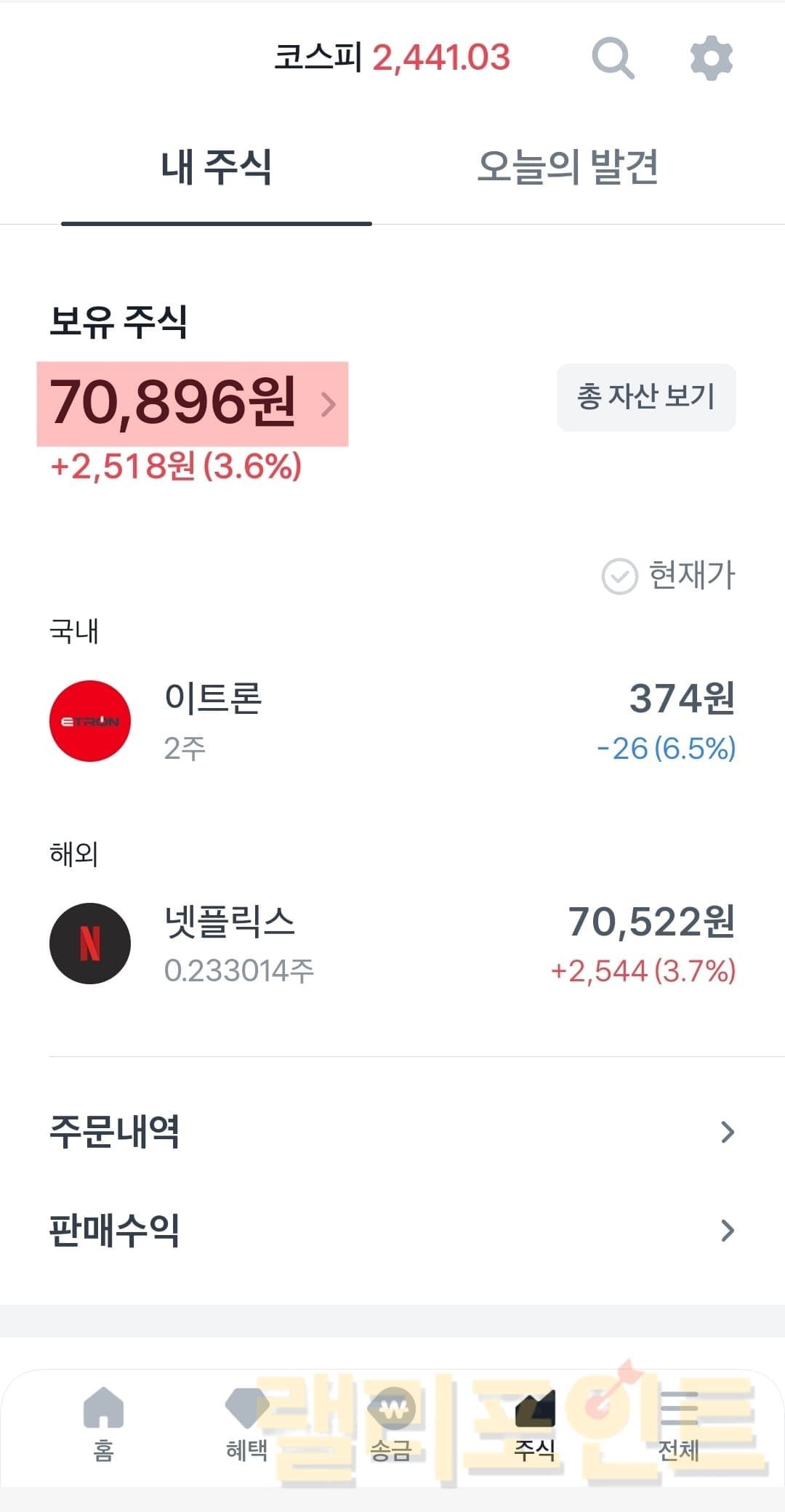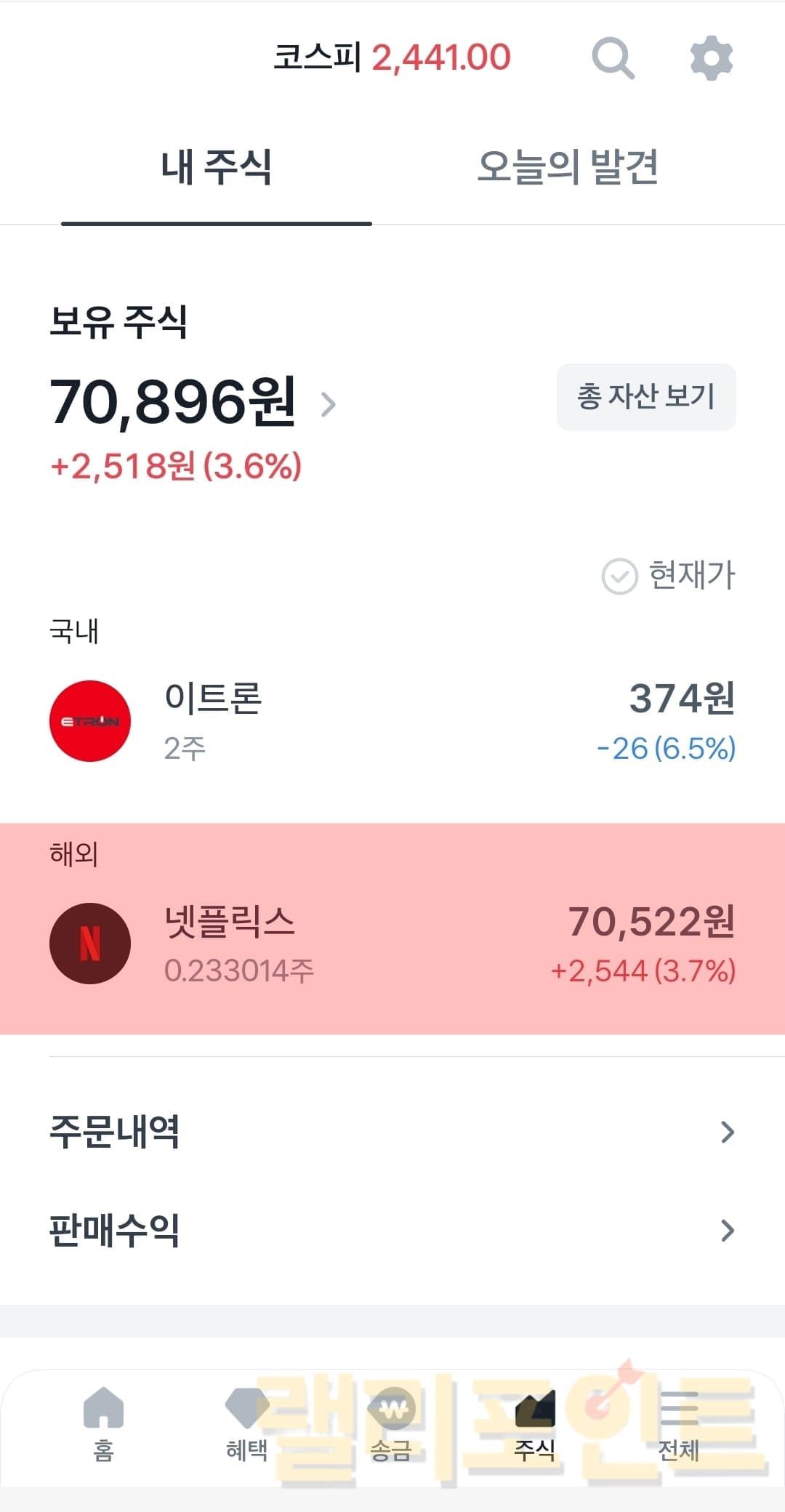 - 토스 주식 메뉴에서 주문내역을 클릭합니다.