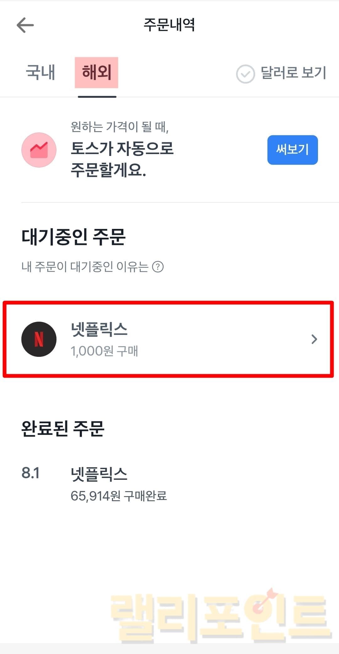 - 해외 탭에서 대기중인 주문을 확인합니다.
