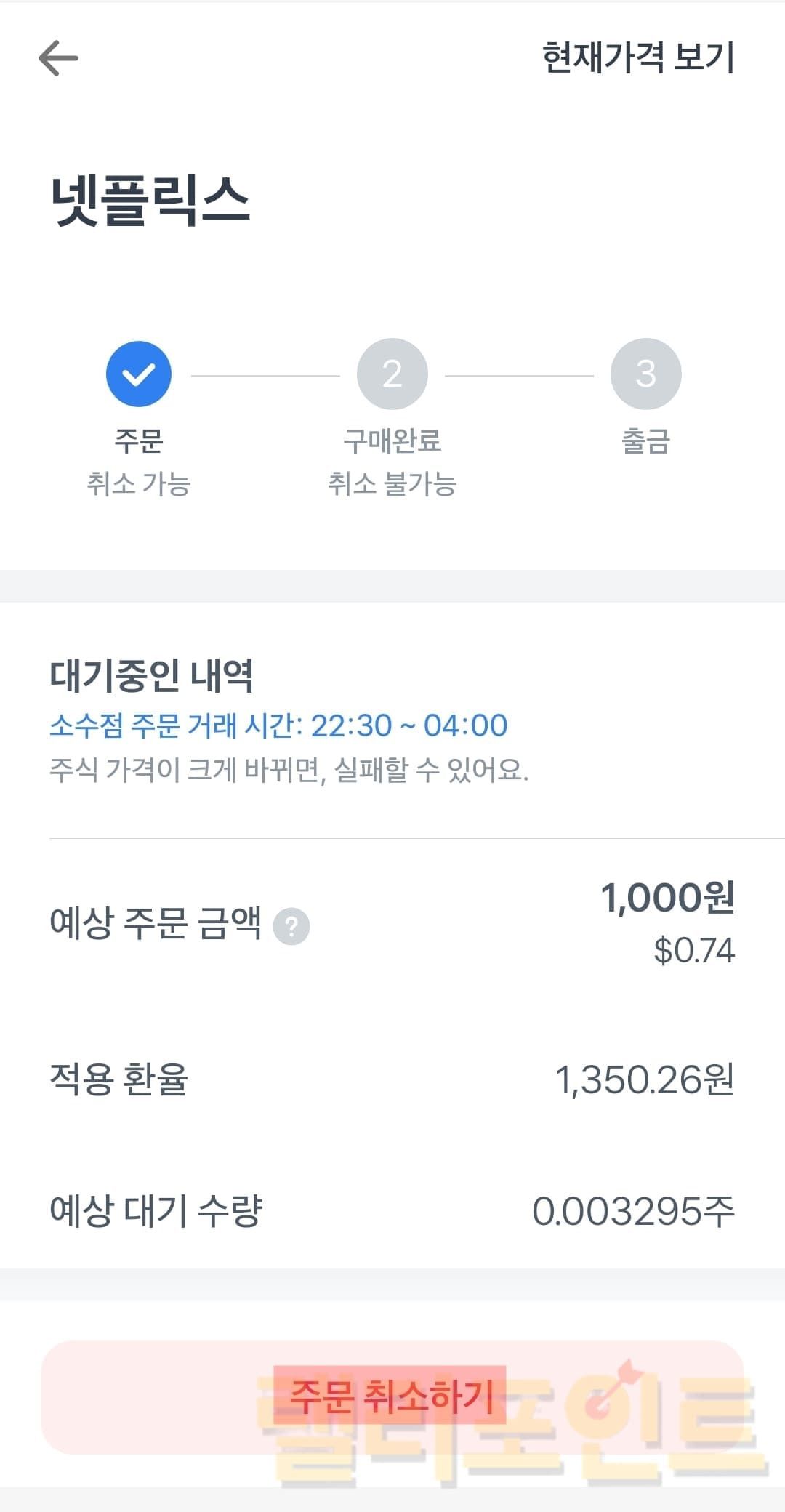 이미 해외주식 매수주문이 체결되었다면 취소가 불가능합니다. 이 땐 아래의 완료된 주문에서 확인하시길 바랍니다.