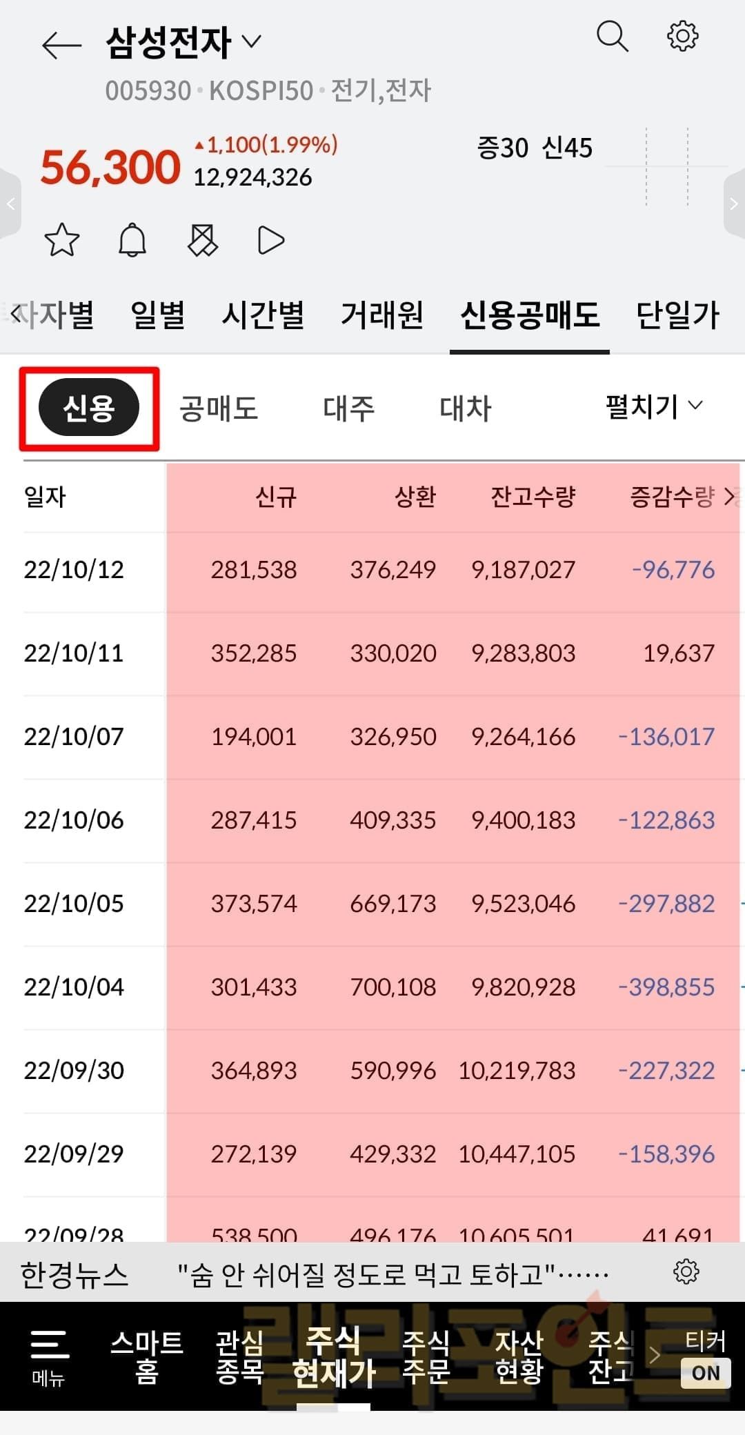 HTS라면 보통 [종목별 신용매매동향] 화면을 찾으시면 되고, MTS에서는 종목 정보 탭에서 [신용] 화면을 찾으시면 됩니다.