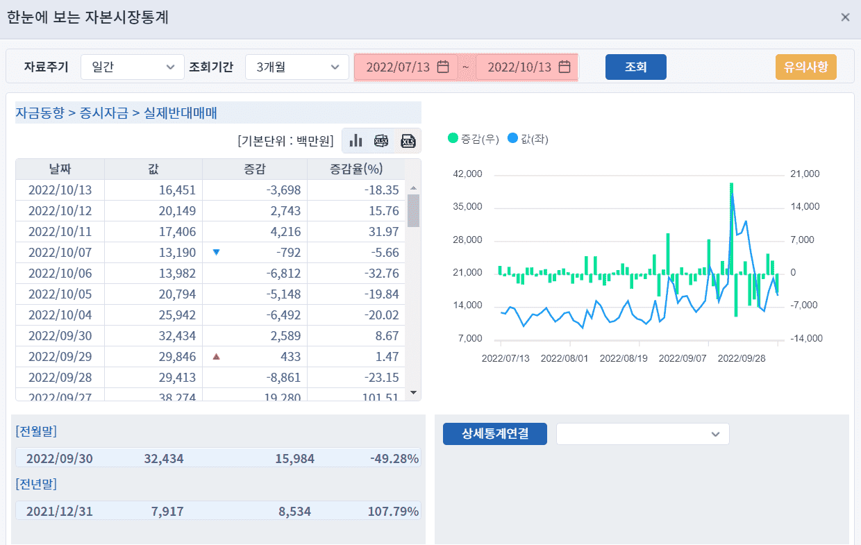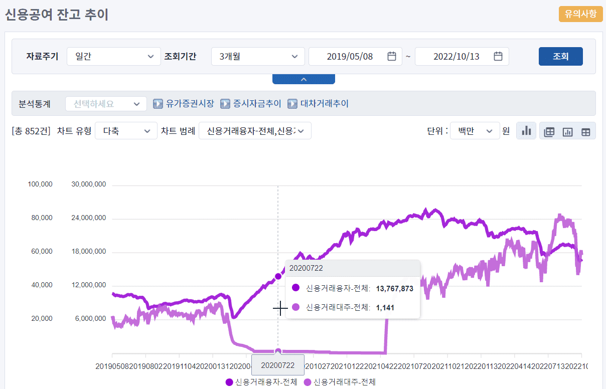 참고로 유가증권이 코스피입니다. 증시 하락과 함께 전체 신용거래융자가 감소중이라면 반대매매 물량이 많이 나오고 있음을 예상해볼 수 있습니다. 과거와 비교하여 현재 신용대출 및 반대매매 물량이 어느정도 수준인지 궁금하시다면 기간을 설정하고 표 형식으로 확인하는 것을 추천드립니다.