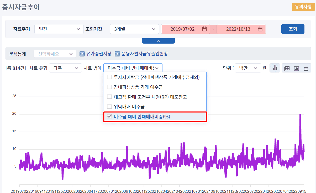 차트 범례를 미수금 대비 반대매매비중을 선택합니다.