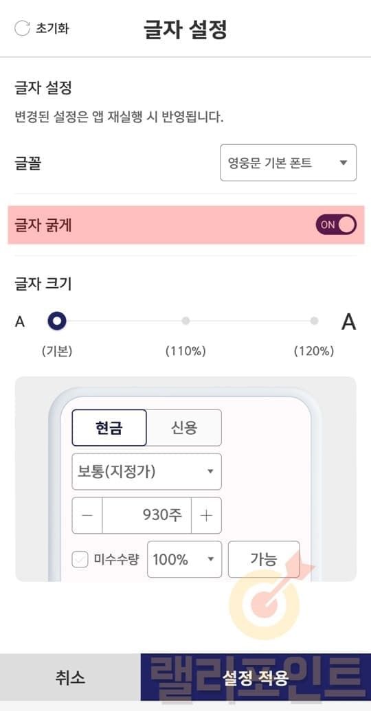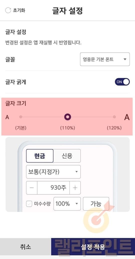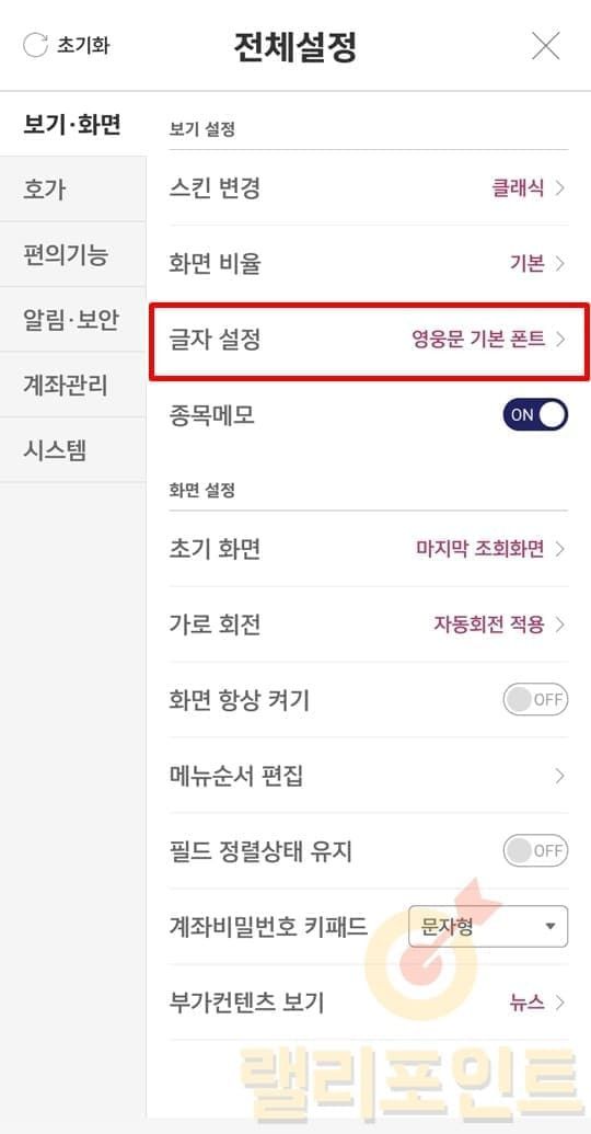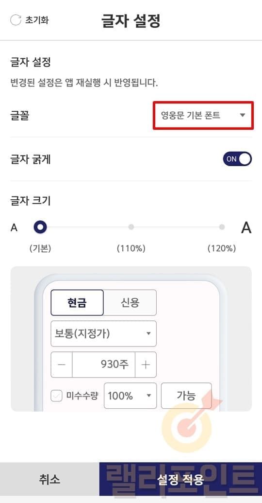 시스템 폰트 설정시 현재 스마트폰의 폰트가 그대로 영웅문S# 앱에 적용됩니다.