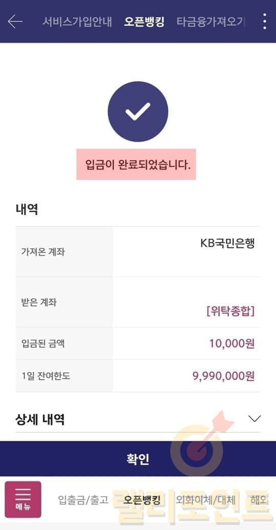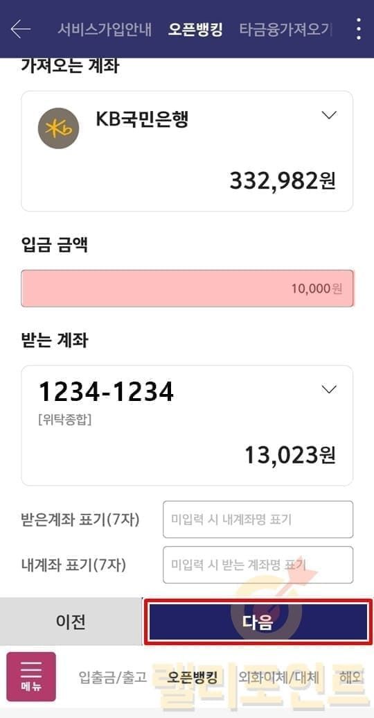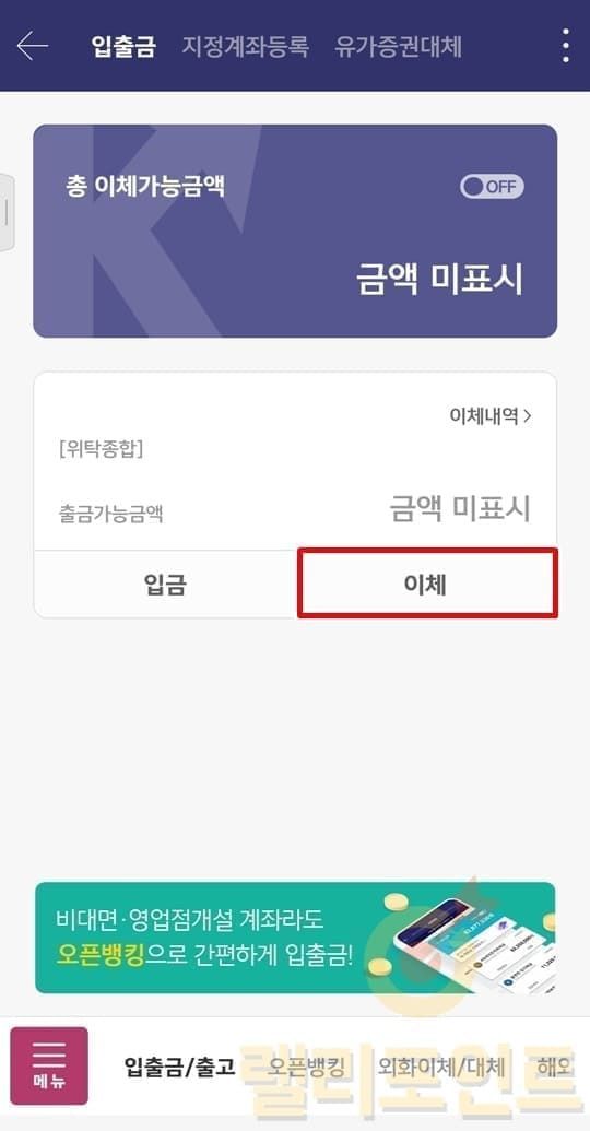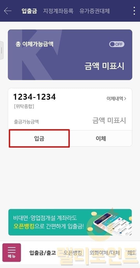 위에서는 오픈뱅킹 서비스를 이용하였습니다만, 만약 내 명의의 계좌가 아닌 타인이 타인계좌로 나의 영웅문S#로 입금시켜주거나 오픈뱅킹 서비스를 가입하고 싶지 않다면 아래 방법으로 직접 이체하는 것도 가능합니다. 또 오픈뱅킹 서비스로는 1천만원까지만 입금이 가능하기에 입금 금액이 많다면 아래 방법을 이용해야 합니다.