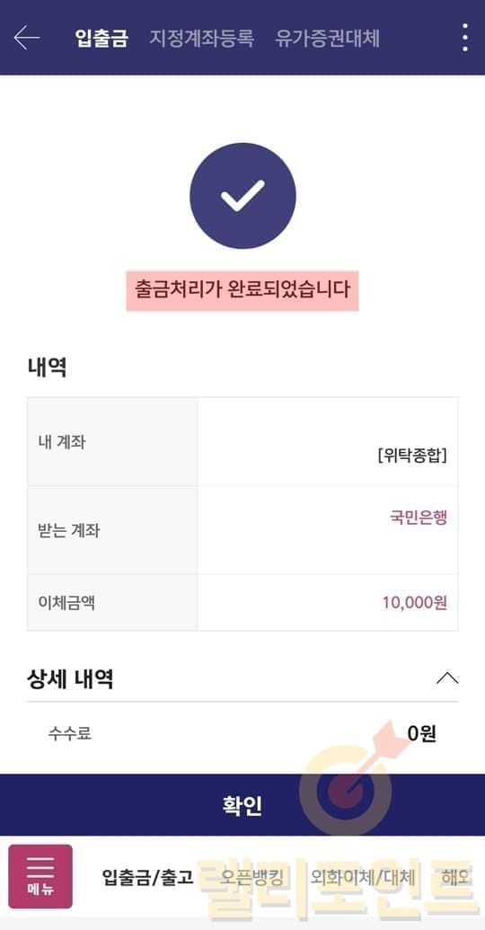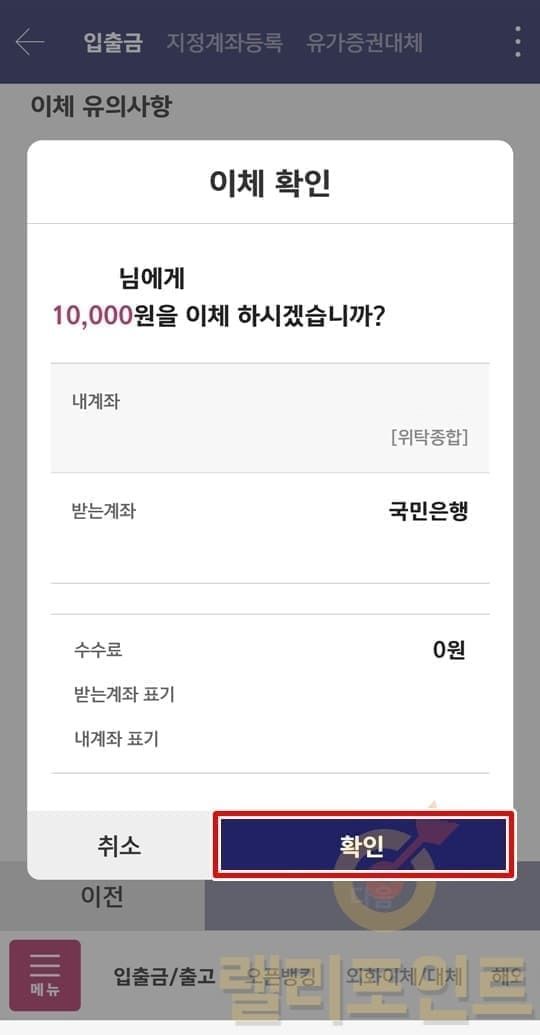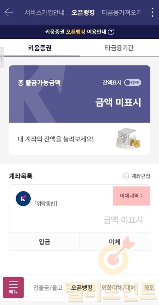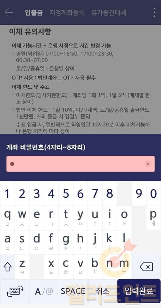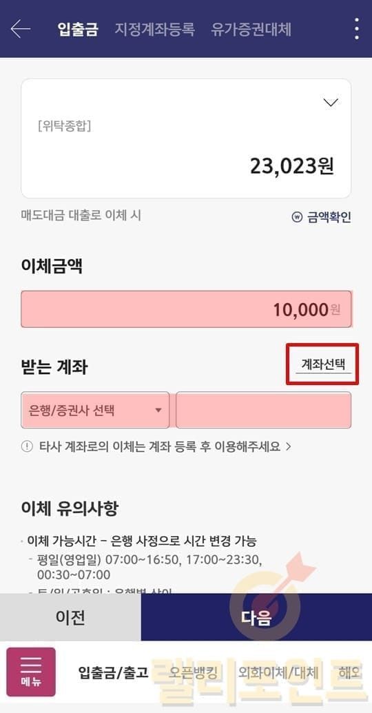 영웅문S# 오픈뱅킹서비스는 천만원이라는 한도가 정해져있음으로 이 땐 지정계좌를 등록해서 출금하시면 됩니다. 지정계좌 이체시 오픈뱅킹서비스에 비해 출금한도가 훨씬 높습니다.