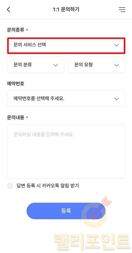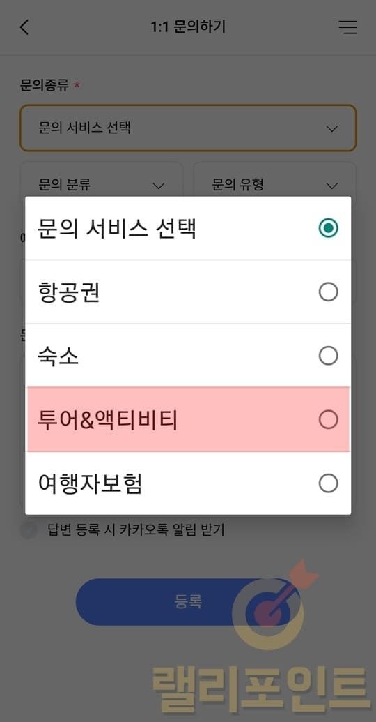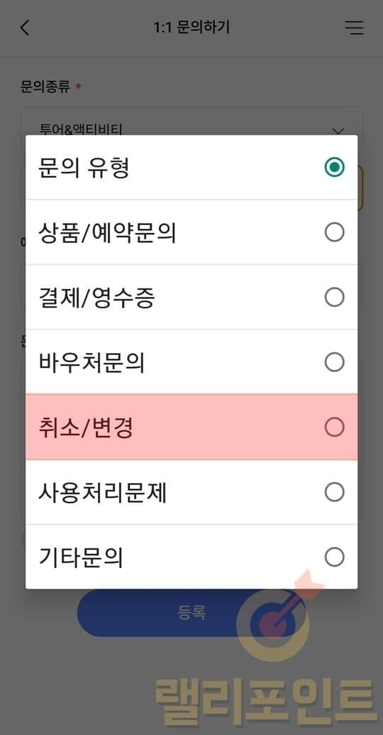 1. 문의 유형을 누르고 취소/변경을 선택합니다.