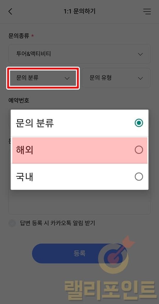 1. 문의 분류를 누르고 내가 구매한 상품에 맞게 해외/국내를 선택합니다.