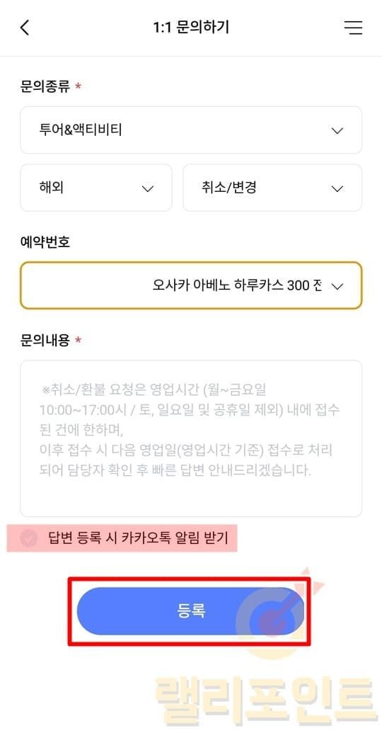 답변 등록시 카카오톡 알림 받기를 체크하면 빠르게 환불처리 현황을 확인할 수 있습니다.