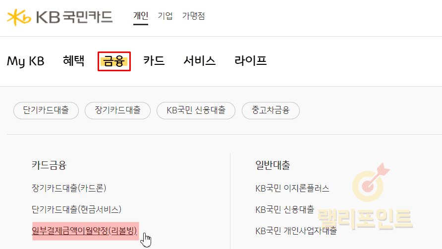 국민카드 홈페이지에서 금융 > 일부결제금액이월약정(리볼빙)을 누릅니다.