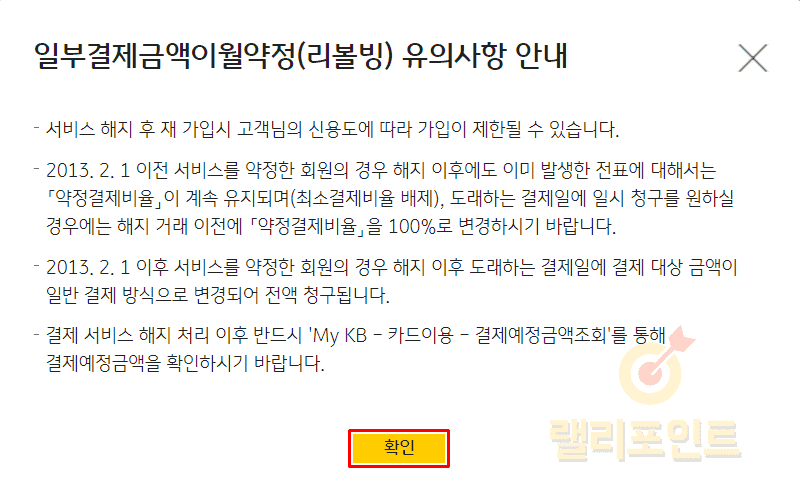 - 국민카드 일부결제금액이월약정(리볼빙) 해지가 완료되었습니다.