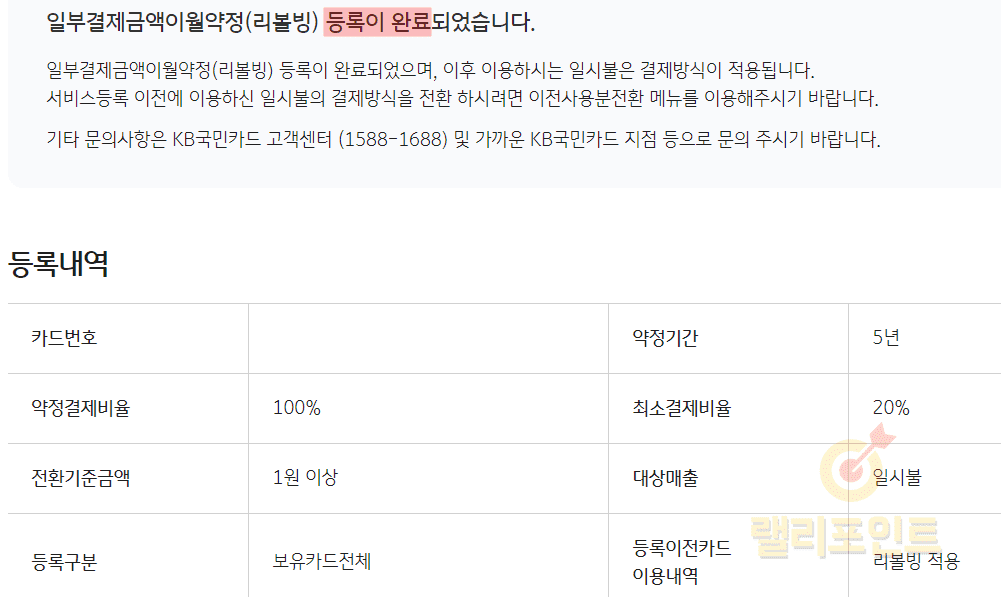 - 국민카드 리볼빙 신청 후 등록이 완료되었습니다.