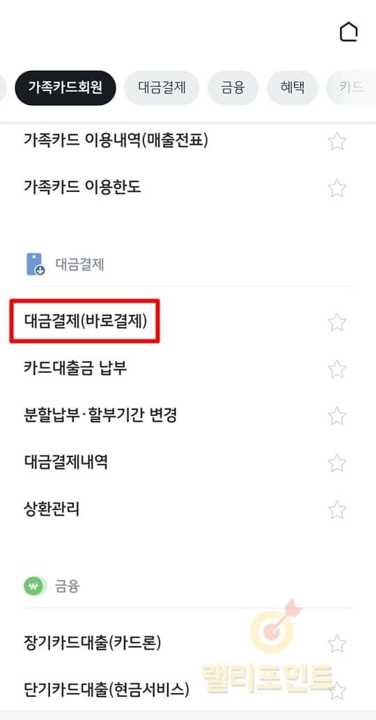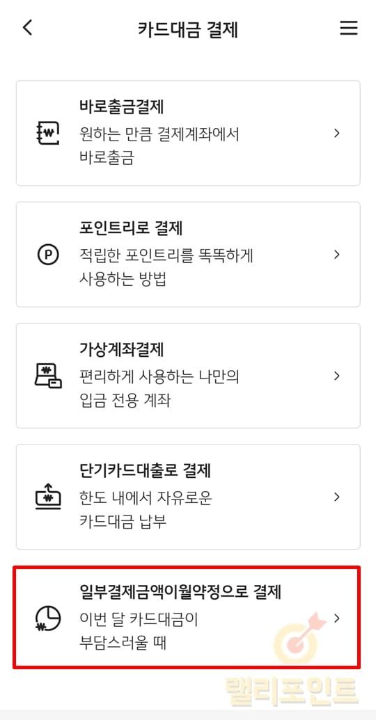 우측 상단 메뉴 > 카드 > 대금결제 > 일부결제금액이월약정으로 결제를 누릅니다.
