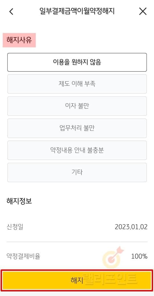 - 해지 사유를 선택하고 해지 버튼을 누릅니다.