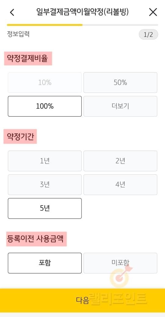약정결제비율, 약정기간, 등록이전 사용금액을 선택합니다.