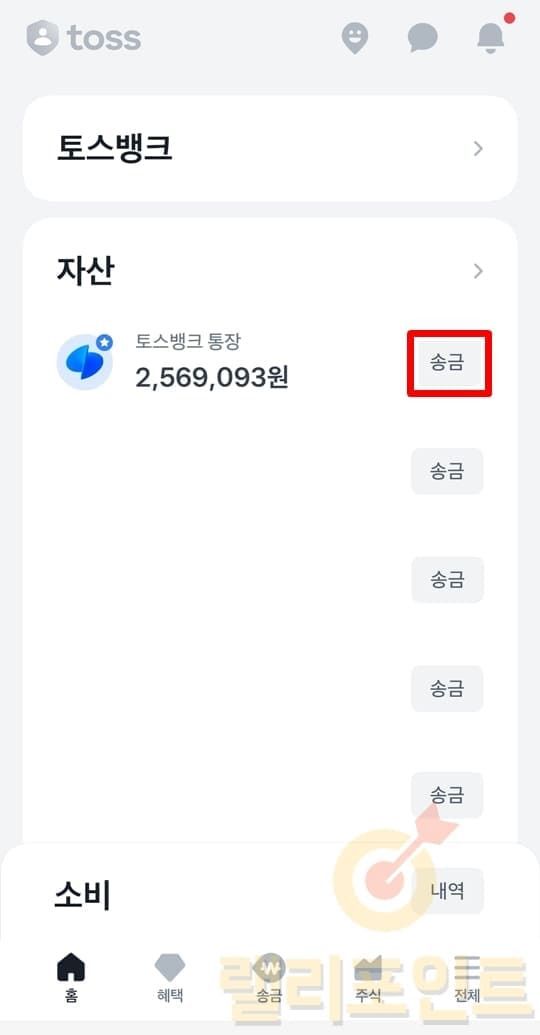 1. 나의 토스뱅크 통장 우측에서 송금버튼을 누릅니다.