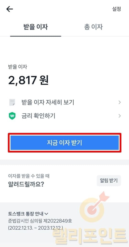 1. 지금 이자 받기를 클릭하면 수령됩니다.
