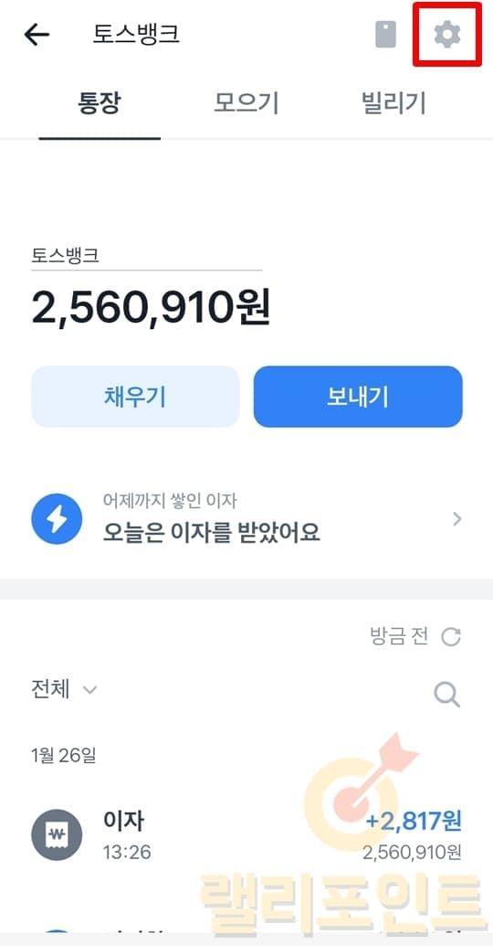 1. 나의 토스뱅크 통장 화면에서 설정 버튼을 클릭합니다.