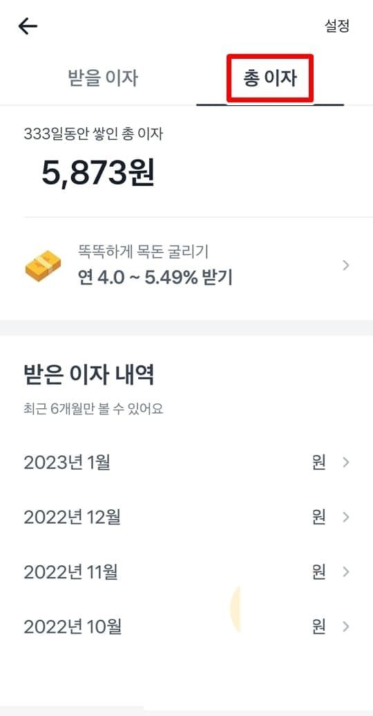 1. 총이자를 눌러 토스 통장으로 지급받은 모든 이자금액을 확인할 수 있습니다.