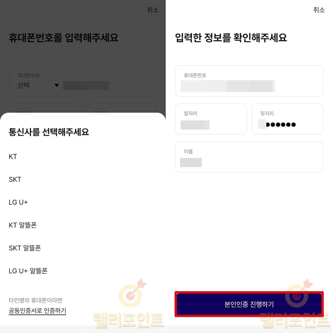 - 본인의 통신사를 선택 후 본인인증 진행하기를 클릭합니다.