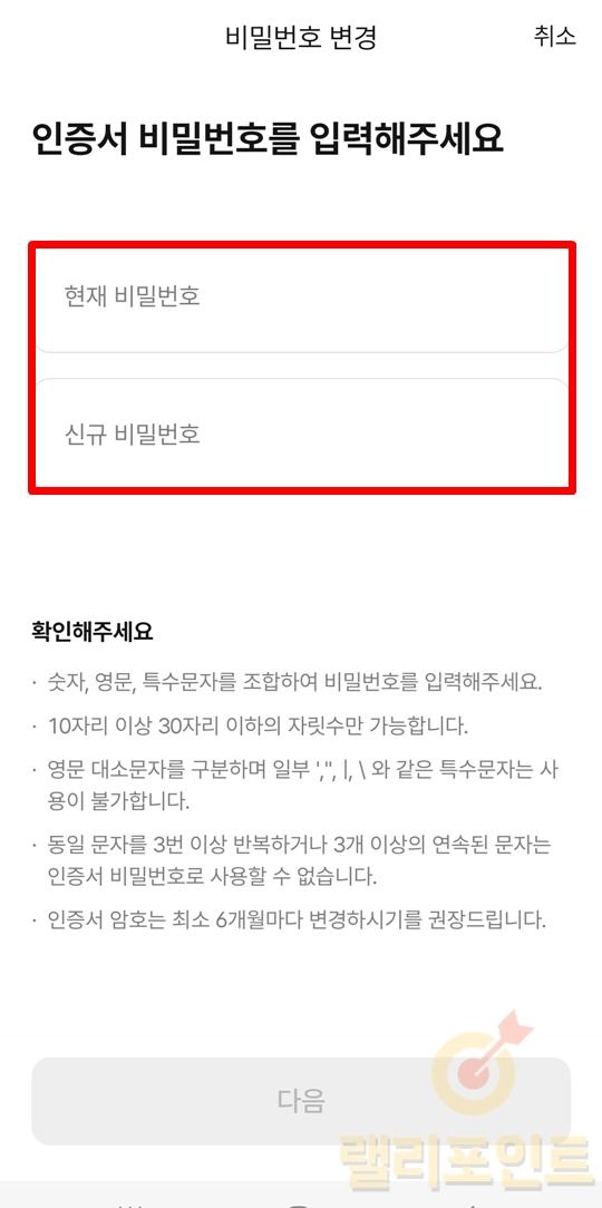 케이뱅크 공동인증서 비밀번호는 숫자, 영문, 특수문자를 조합해야 하며 10자리 이상 30자리 이하의 자릿수로 설정하셔야 합니다. 영문 대소문자가 구분되며 일부 특수문자는 사용이 불가능하니 주의하시길 바랍니다. 만약 동일 문자를 3번 이상 입력하거나 3개 이상의 연속된 문자는 비밀번호 설정이 불가능합니다.