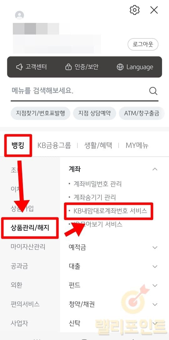 1. 뱅킹 > 상품관리/해지 > KB내맘대로계좌번호 서비스를 클릭합니다.