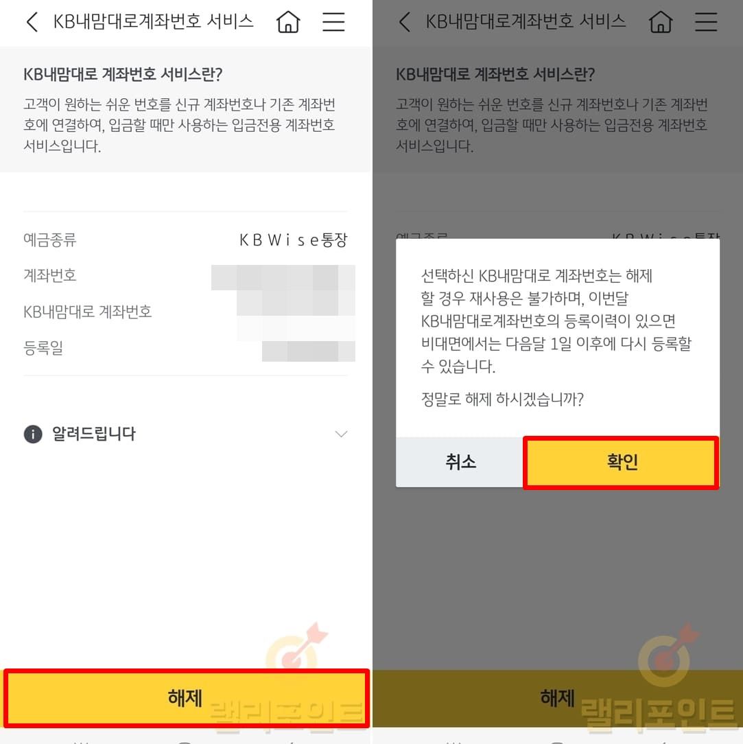 모바일: KB스타뱅킹 앱 실행 > 메뉴 버튼 > 뱅킹 > 상품관리/해지 > KB내맘대로계좌번호 서비스 > 해지 > 확인