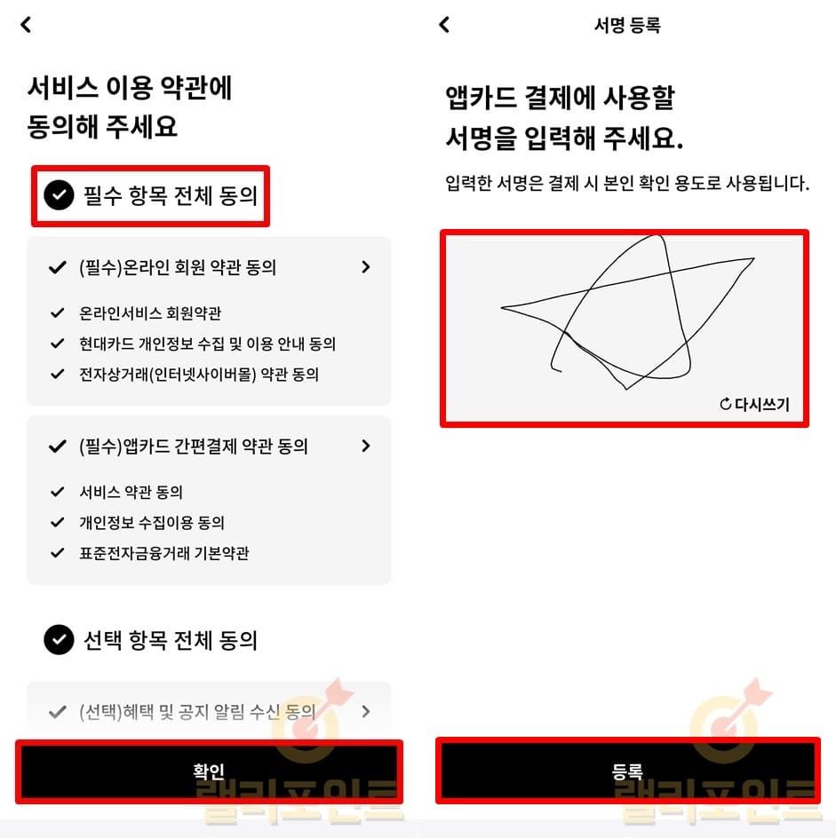 1. 약관 동의 및 앱카드 서명 및 비밀번호를 설정합니다.